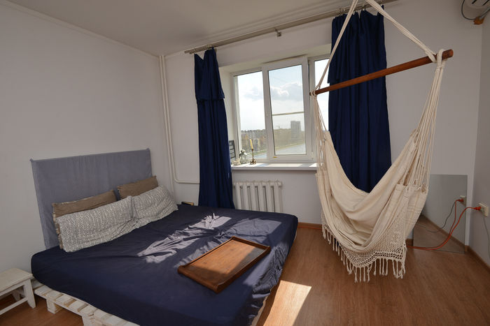 سرير معلق مصنوع من المنصات لشقة فريدة من نوعها وغير عادية للغاية