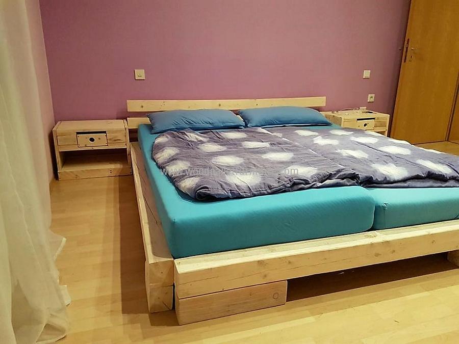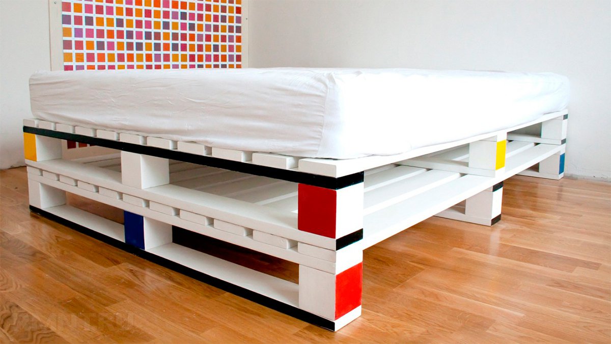 لا توجد تقنية إنشاء محددة. يسعى كل سيد إلى إنشاء مشروع ، كما يراه بطريقته الخاصة. لصنع سرير مزدوج عادي من منصات بحجم 240 * 200 ، تحتاج إلى 12 قطعة.