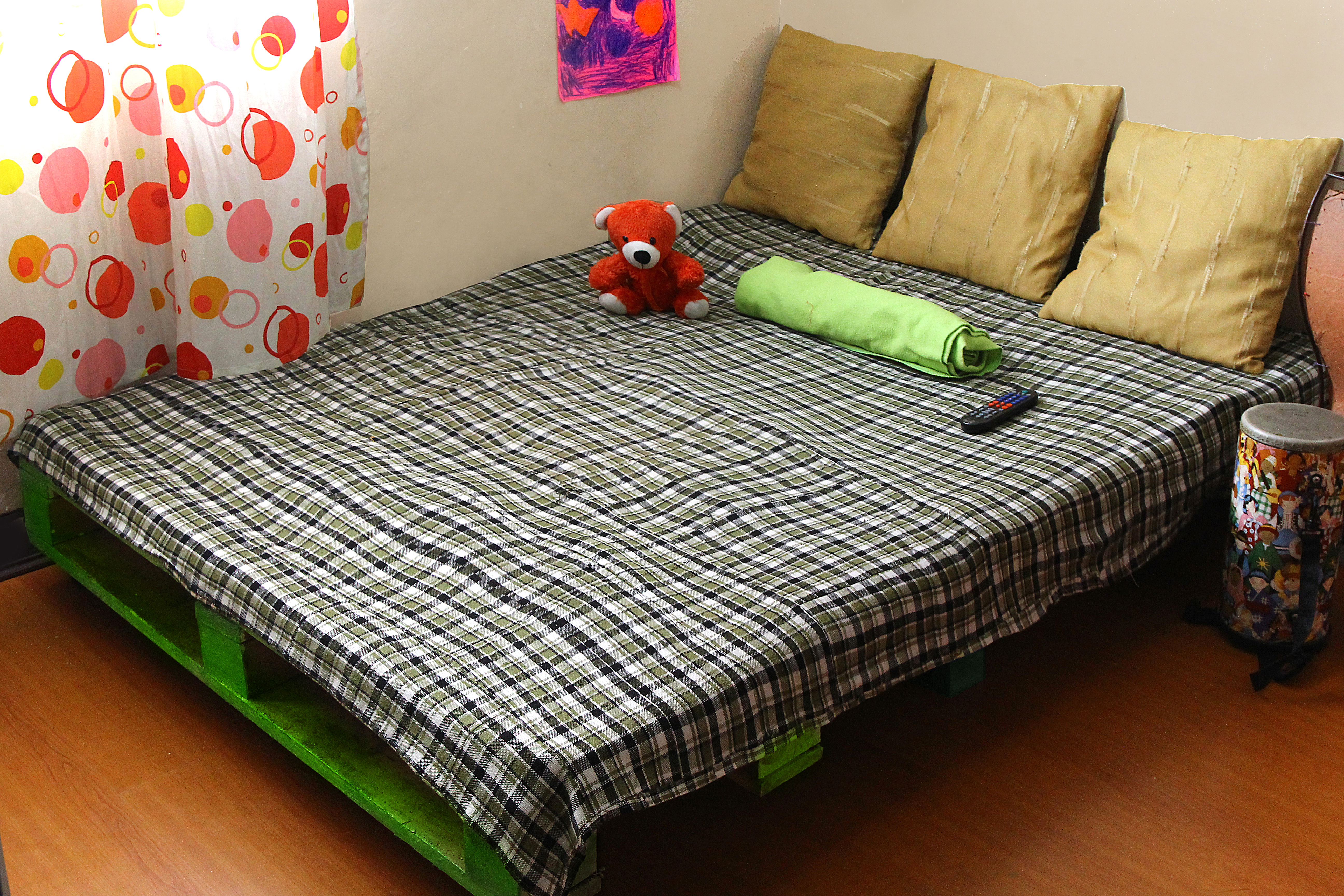 إنه مناسب جدًا لوضع سرير من المنصات مع لوح أمامي وطاولة بجانب السرير مدمجة