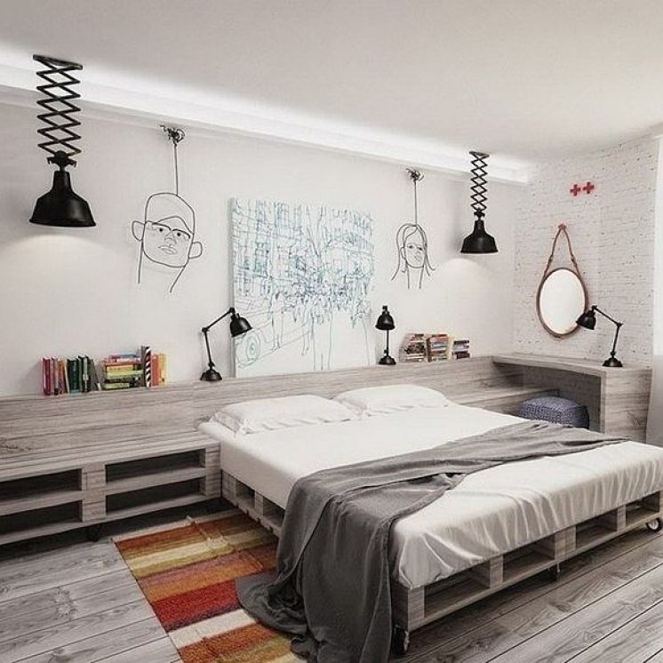 الاستخدام غير المعتاد لمواد البناء في ترتيب غرفة النوم يعطي الداخلية نظرة عصرية. لا تبدو الأسِرَّة من المنصات الأصلية أصلية فحسب ، بل أيضًا عملية ومريحة للاستخدام وفعالة من حيث التكلفة من حيث الشراء.