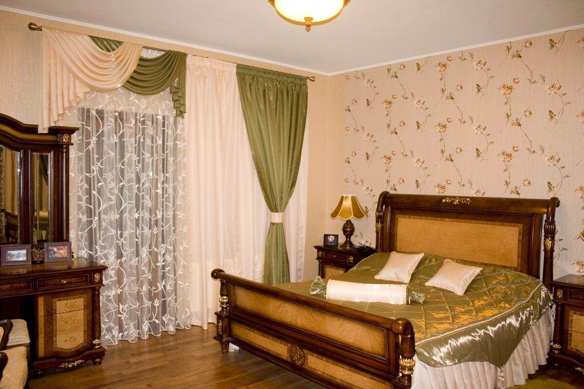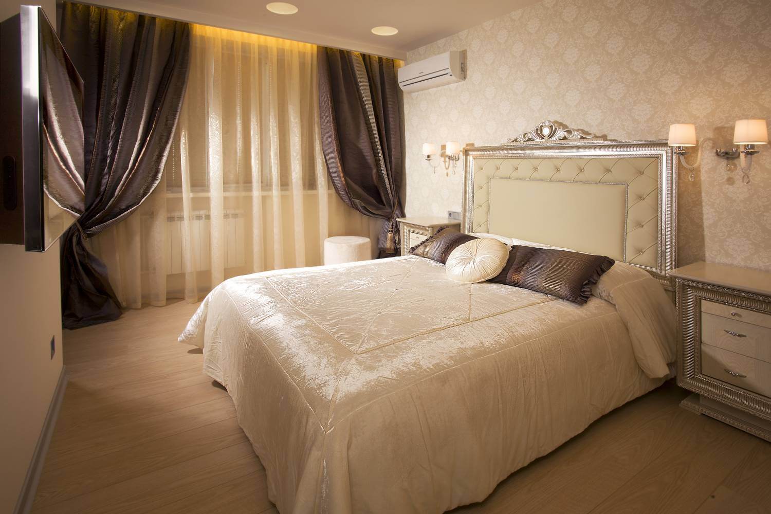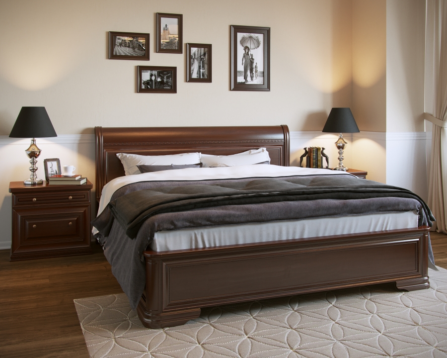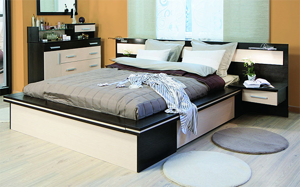 كلاسيكي خيار تعتبر الإنشاءات مناسبة للغرف المتوسطة والكبيرة ، حيث يمكن تثبيت خزانة ملابس (خزانة أو خزانة مدمجة) وطاولات بجانب السرير أو خزانة ذات أدراج وطاولة لتبديل الملابس مع مرآة وإضافة العثمانيين أو كرسي بذراعين إلى الغرفة.