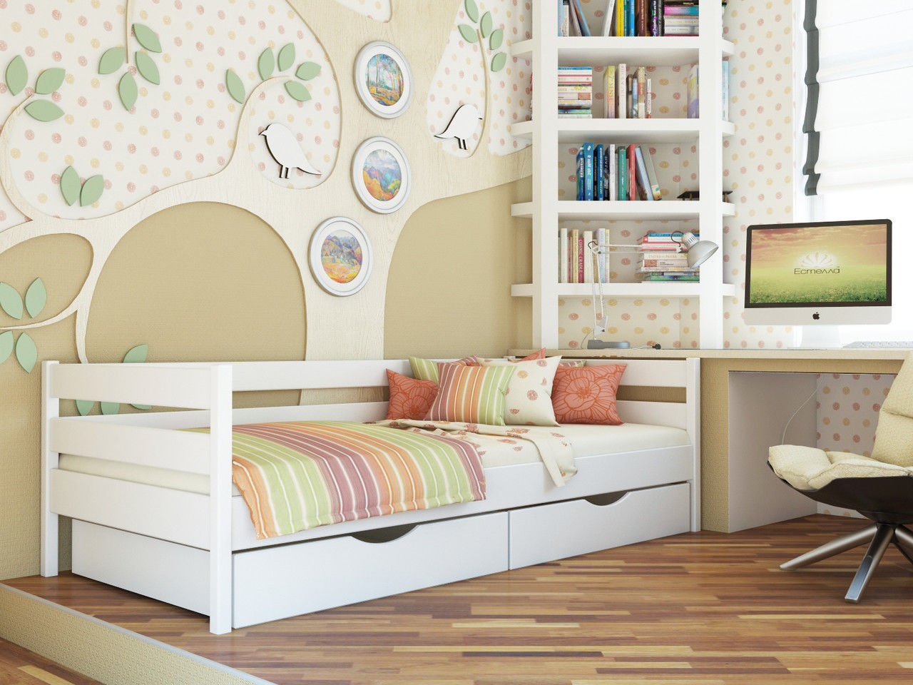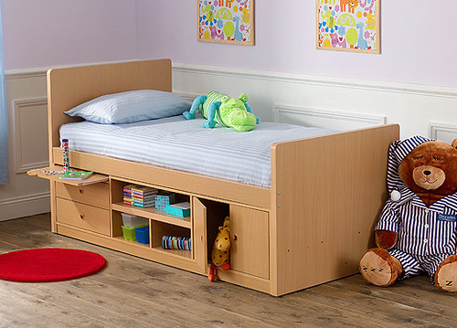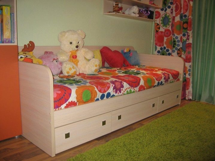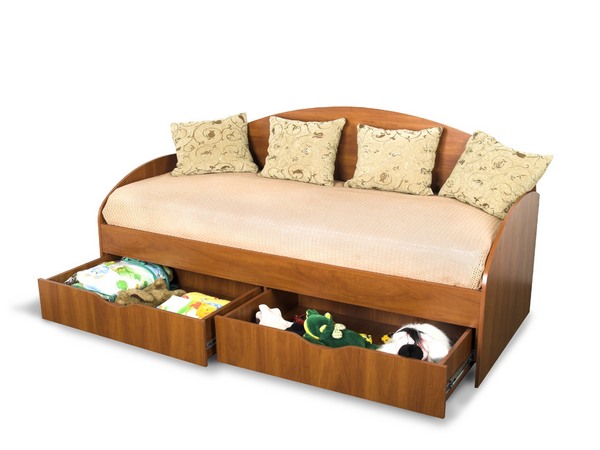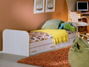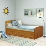 - سرير مفرد مع أدراج أثاث خشبي متعدد الوظائف. تحتوي بعض طرازات الأسرة على إطار معدني ، مما يزيد من متانتها وقوتها. بالنسبة للأطفال ، يمكنك اختيار طرازات الأسرّة المصممة في شكل ألعاب مختلفة مزينة بألوان مختلفة.