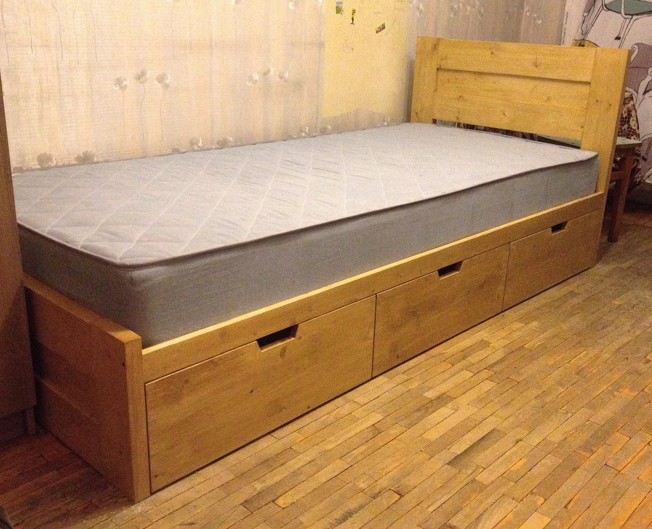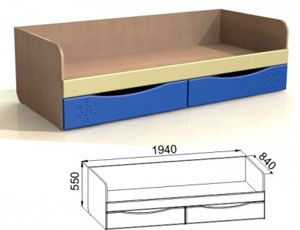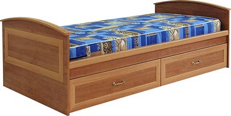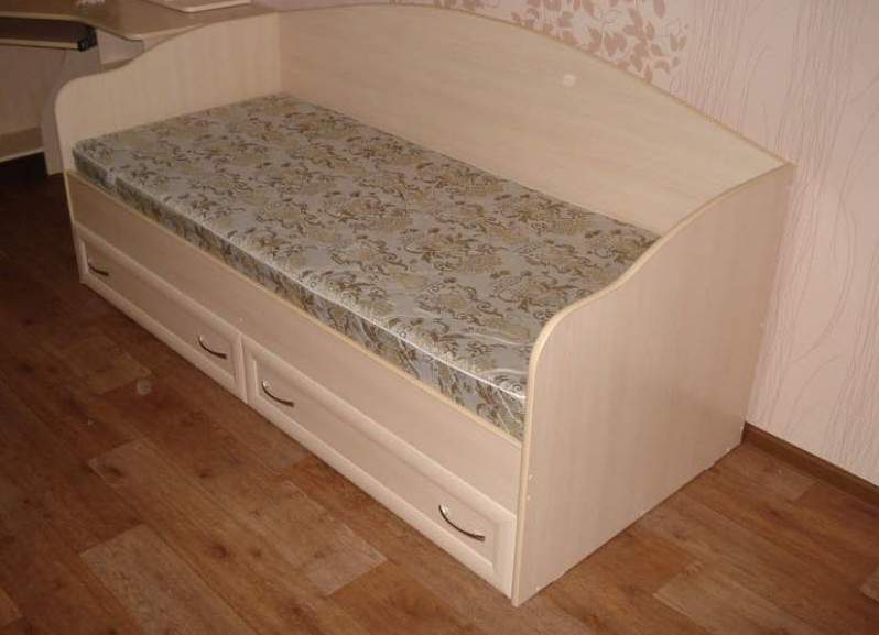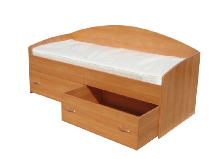 يتكون السرير الفردي من الإطار والقاعدة واللوحات الجانبية واللوح الأمامي ولوحة القدم. أساس المنتج مغطى بالشرائح أو الخشب الرقائقي. في أسفل السرير يوجد واحد أو أكثر من الأدراج التي تأتي مع آليات الرفع أو الانزلاق. تعد الأسرّة المفردة التي بها صندوق على جهاز الرفع مثالية للغرف ذات المساحة الصغيرة أو في الأماكن التي يكون من غير المناسب فيها فتح الأدراج بسبب عدم توفر المساحة. يتم استخدام الأدراج المطاطية للأدراج ، فهي تتدفق بسلاسة ولا تترك خدوشًا على الأرض.