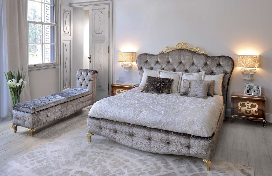 سرير بالغ مع لوح أمامي ناعم مع ديكور جميل.