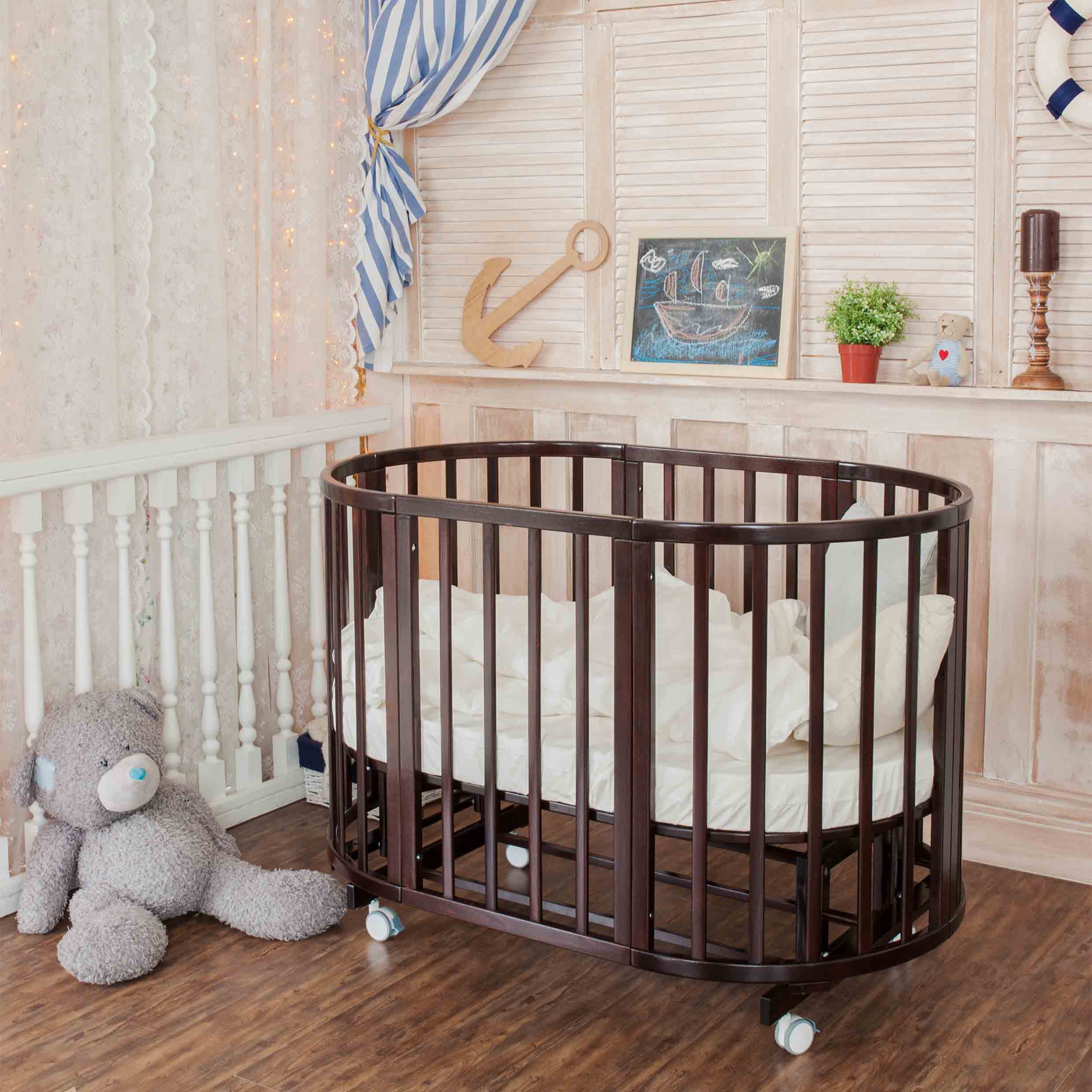 سرير بيضاوي للطفل في الحضانة بأثاث أزرق وأبيض غير عادي