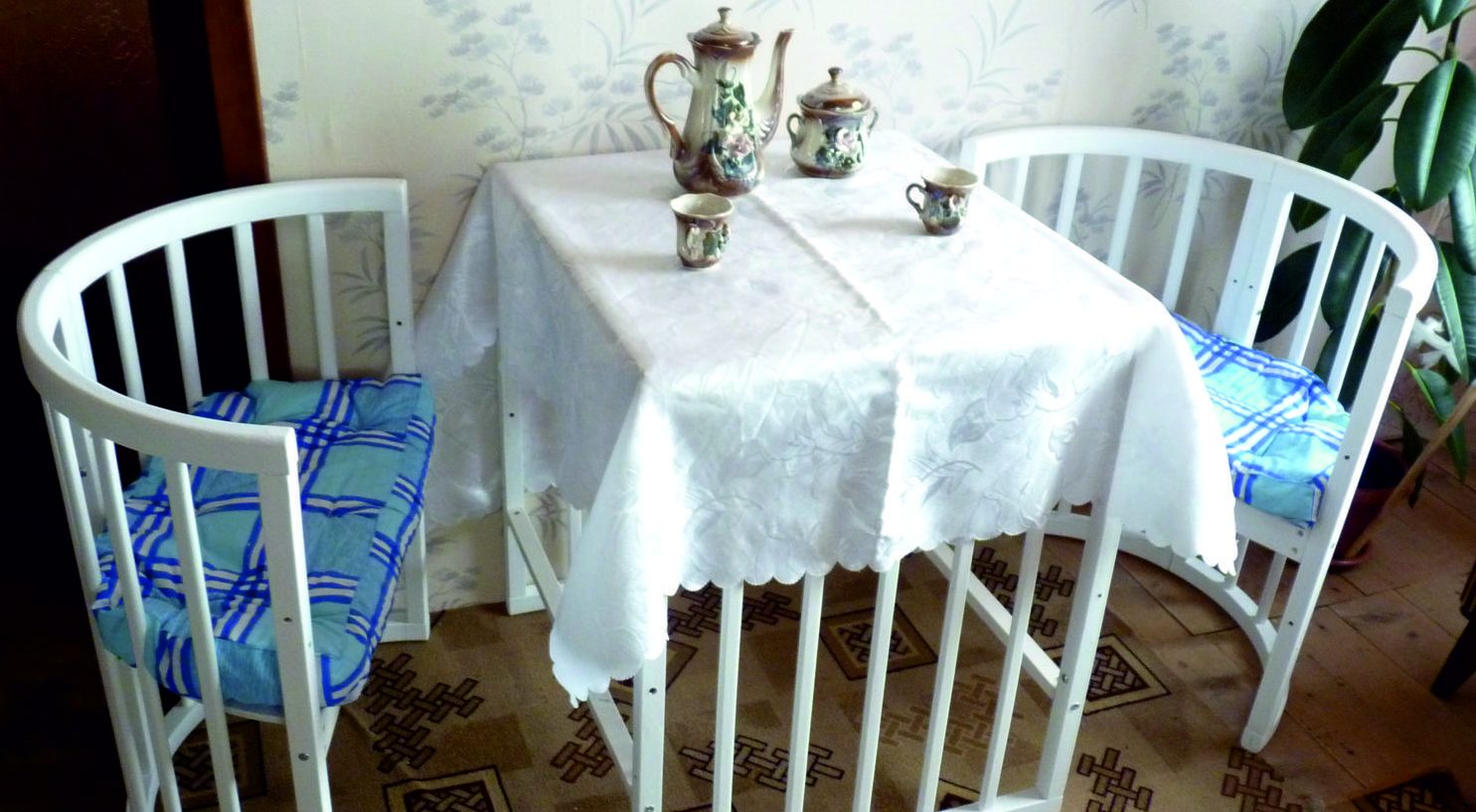 السرير تحويل في شكل تفكيكها كجدول والكراسي شبه دائرية عالية