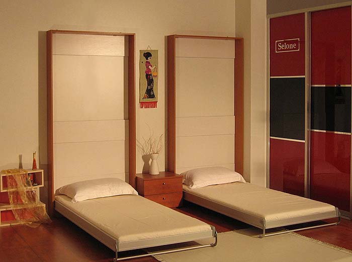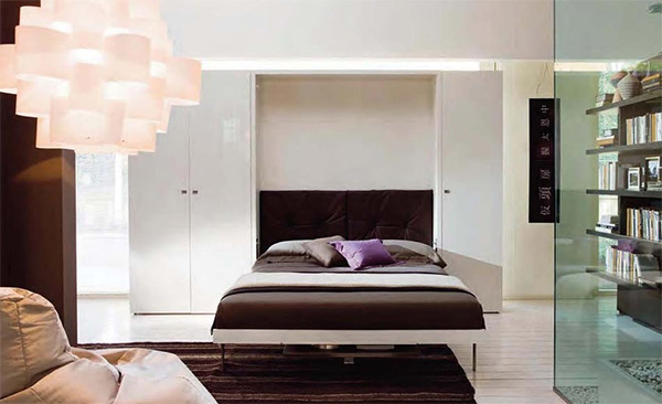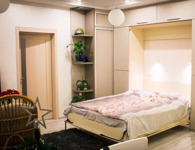 خيار مناسب للشقق الصغيرة ، حيث يكون لكل متر مجاني قيمة. الجانب السلبي لهذا الترتيب هو الحاجة إلى رفع وخفض السرير يوميا.