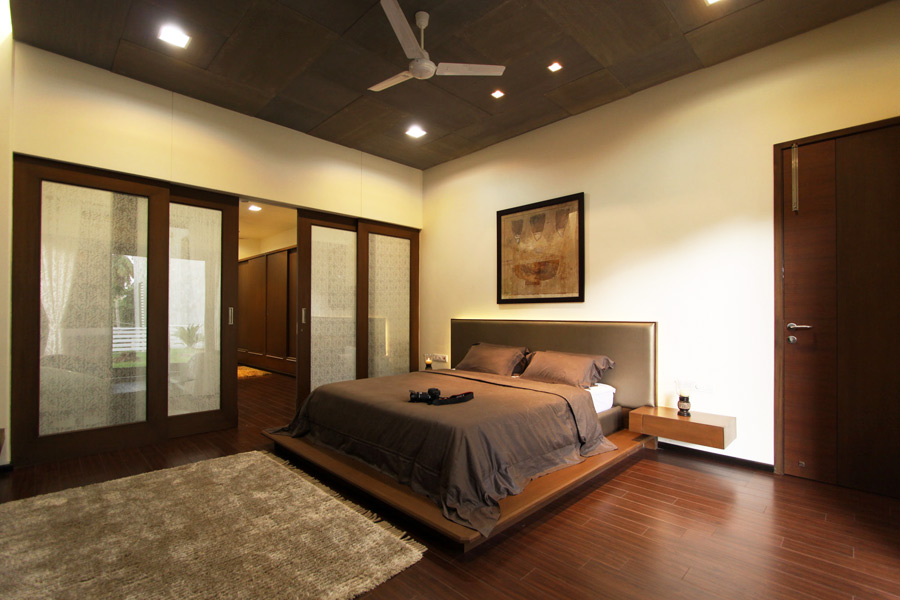 حول السرير تم تصميم مفهوم التصميم الكامل للغرفة للنوم والراحة.