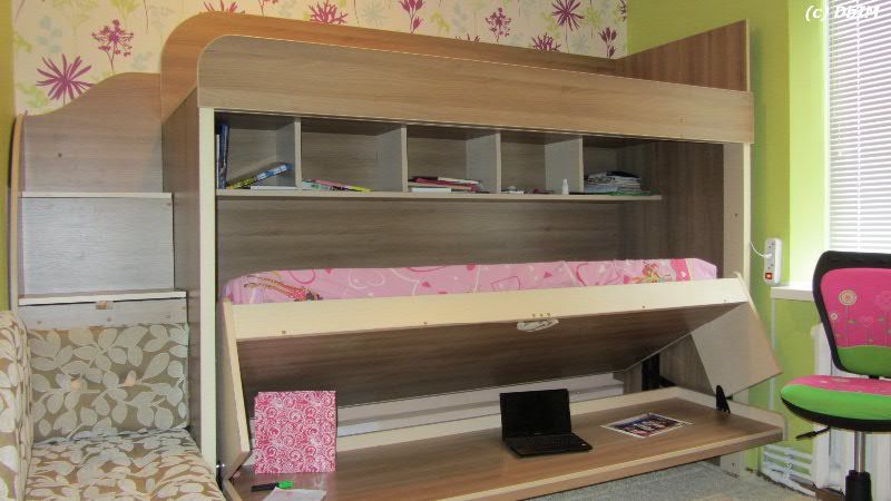 - أثناء النهار ، تختبئ الطبقة السفلية في مكانة خاصة ، في الليل ، يعمل السرير كسرير لشخصين في وقت واحد. يمكن استخدام المنطقة الحرة للغرفة كمكان للألعاب ، مما يساهم في النمو البدني الطبيعي للأطفال.