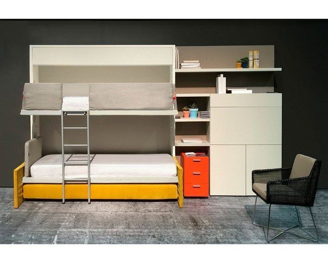 إذا كانت هناك حاجة لتخصيص بضعة أمتار مربعة من المساحة ، وكذلك لوضع سريرين ، فيمكنك الانتباه إلى السرير بطابقين القابل للسحب. وكقاعدة عامة ، يتم استخدام هذه النماذج في غرف الأطفال.