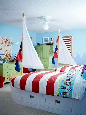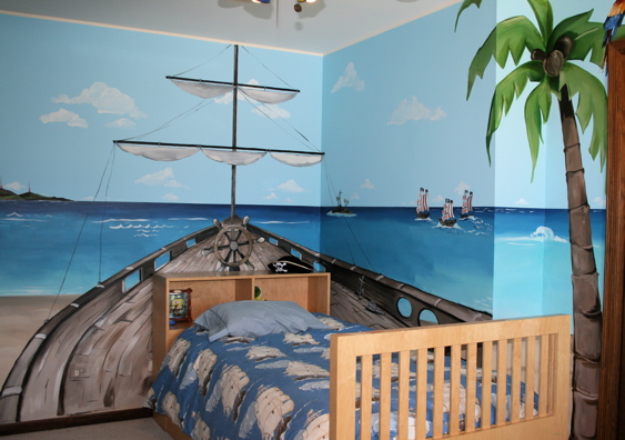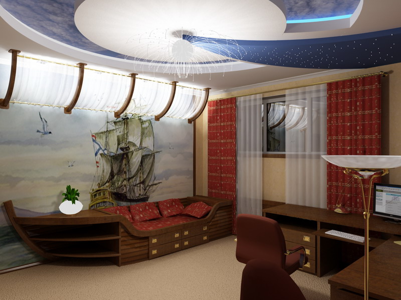 الأطفال أنفسهم فنانين رائعين. امنح الطفل البالغ في غرفته الفرصة لرسم بعض الأشياء حسب ذوقك. إذا كان يحب المساحة ، فيمكنك تقليد سماء مرصعة بالنجوم باستخدام مصابيح صغيرة على السقف. وإذا كان الخط الحديدي ، فيمكن استكمال هيكل النوم بـ "عناصر" من القطار - عجلات وأنبوب صغير.