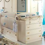 السرير فوقهم. هذا التصميم يحل على الفور مشكلة تخزين الفراش والملابس الصغيرة ولعب الأطفال الصغار. كل هذا سوف تقع مغلقة ومطوية بدقة. في السنوات الأولى من حياة الطفل ، يعد هذا التخزين أكثر ملاءمة.