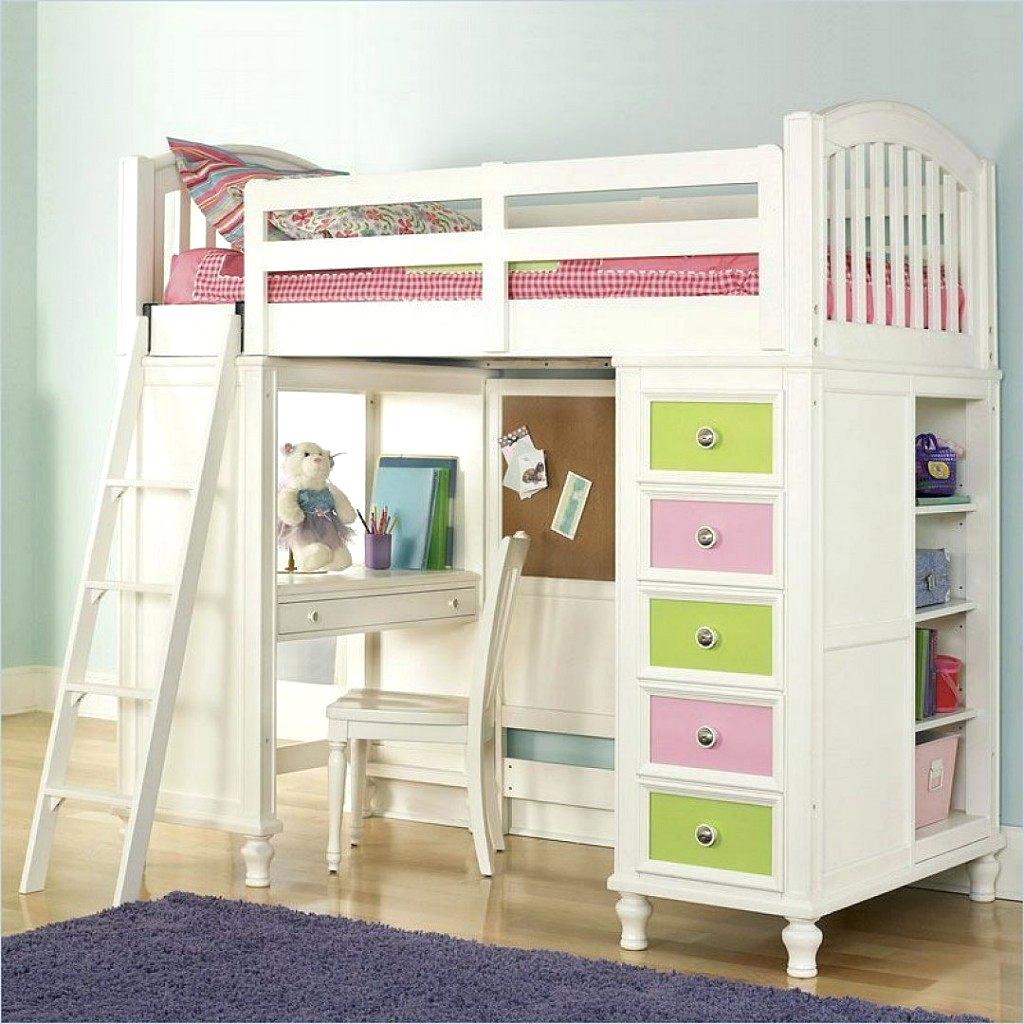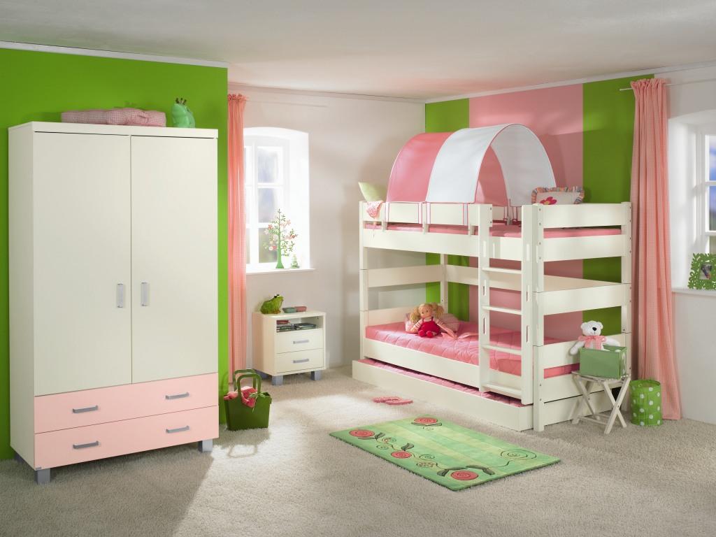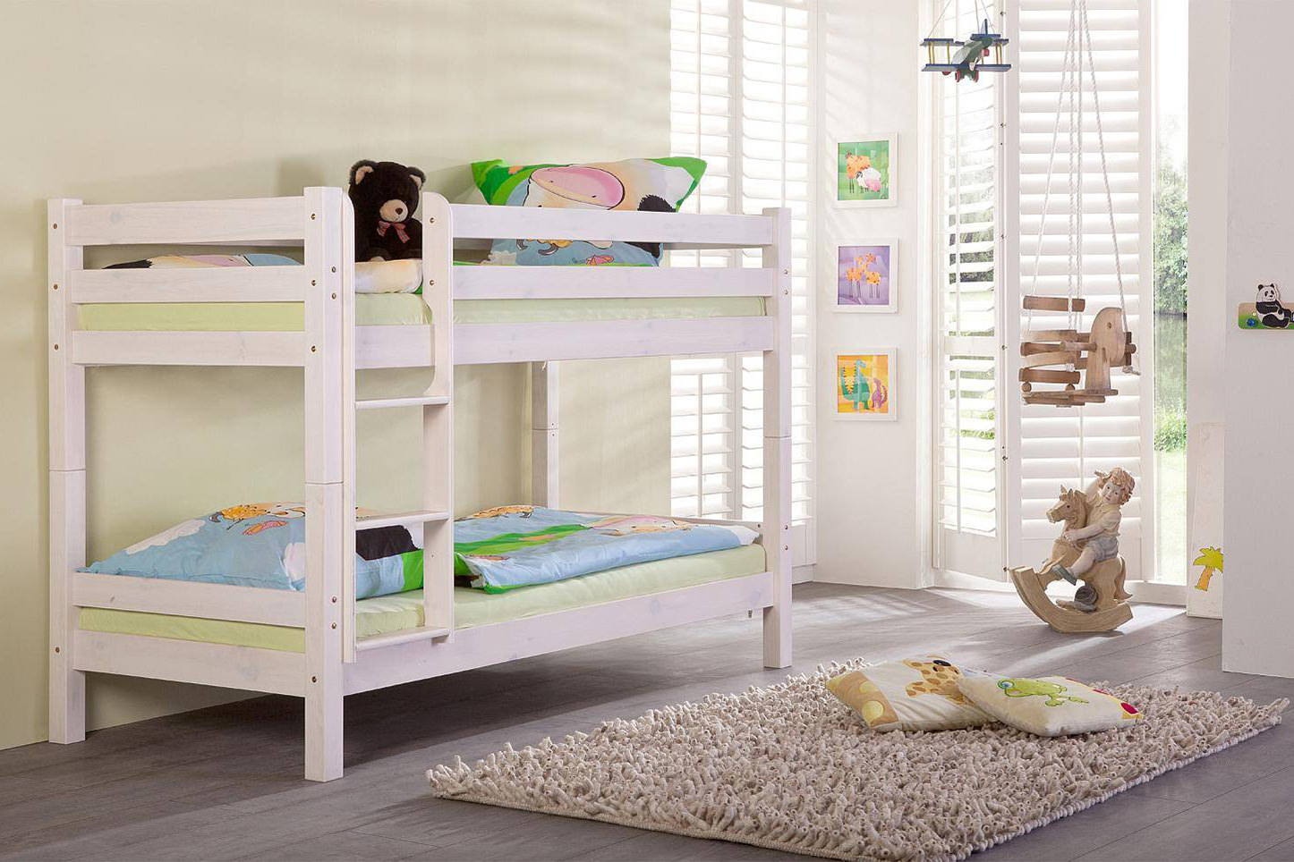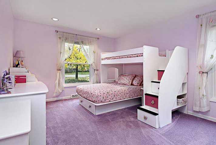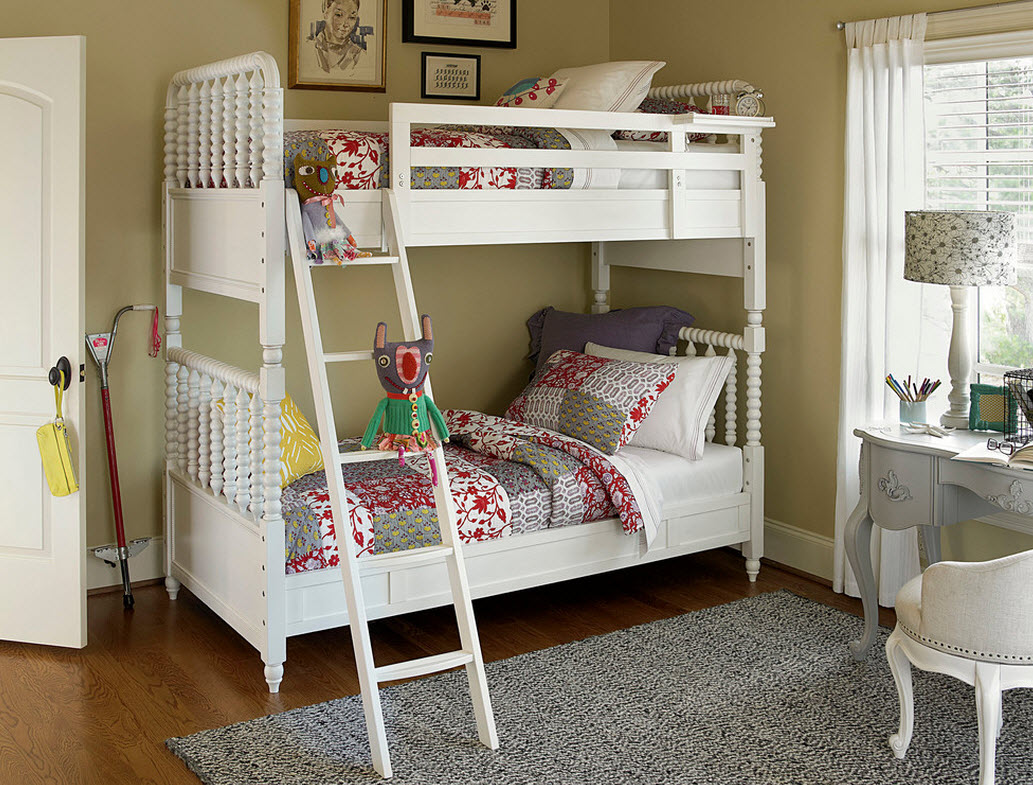 سرير خشبي أبيض بطابقين في غرفة للفتيات