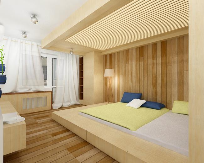 في النهار ، يمكن إخفاء السرير تحت المنصة وتحرير معظم غرفة المعيشة أو غرفة النوم. في الوقت نفسه ، سيكون من الممكن الجمع بين منطقة الترفيه والضيف ومنطقة التخزين.