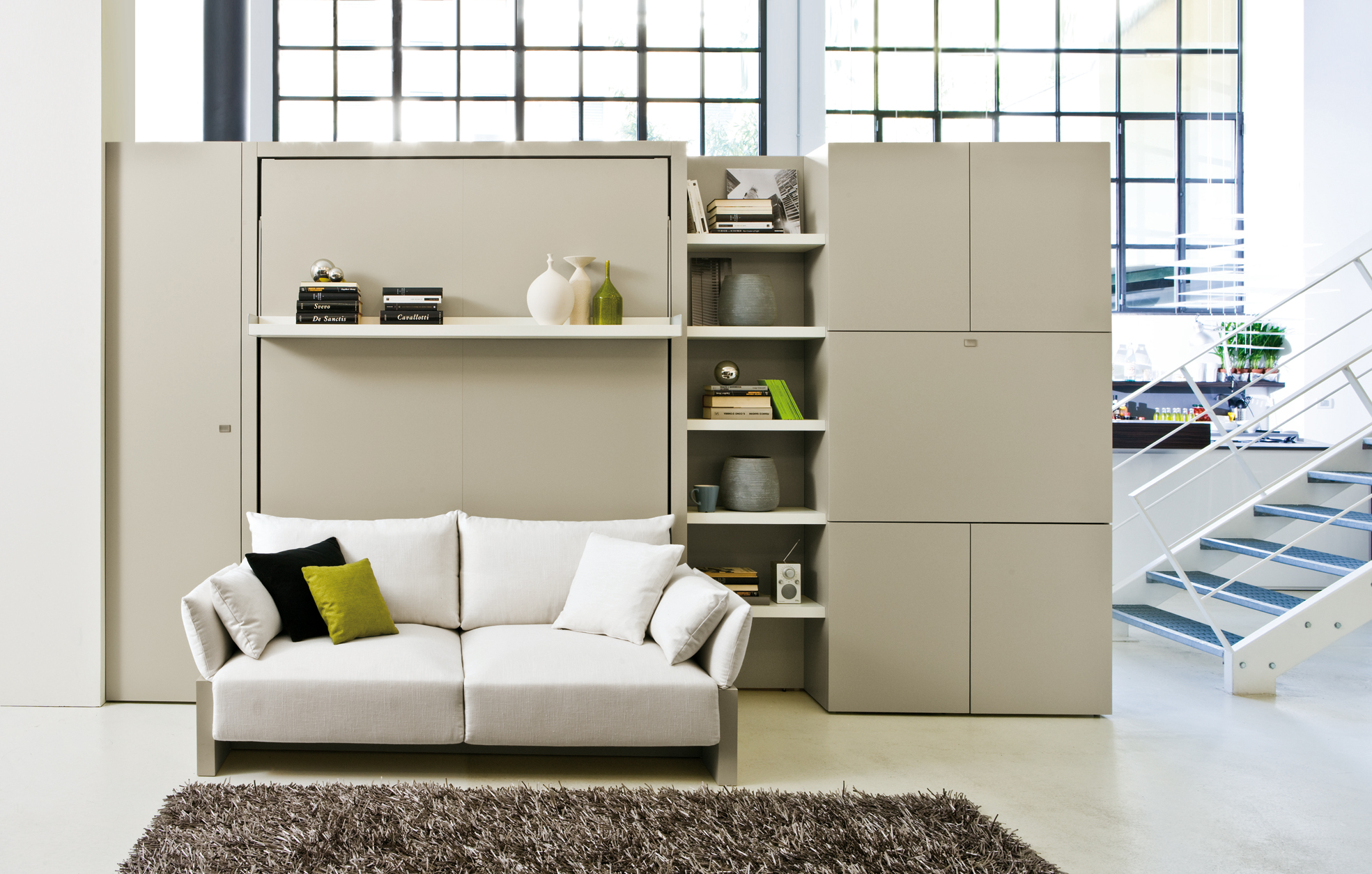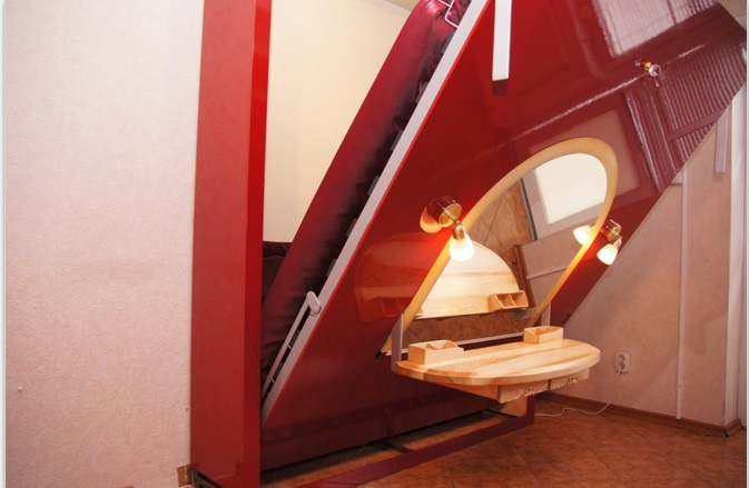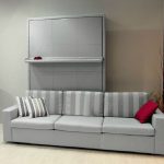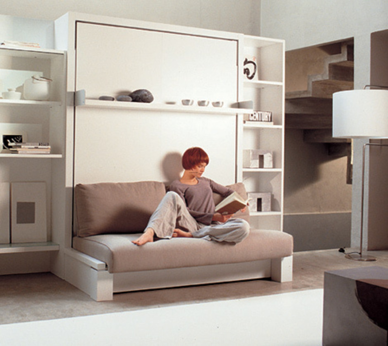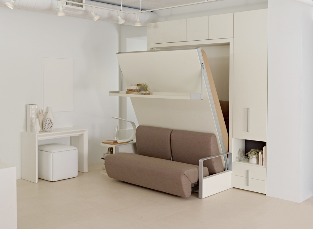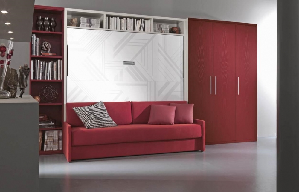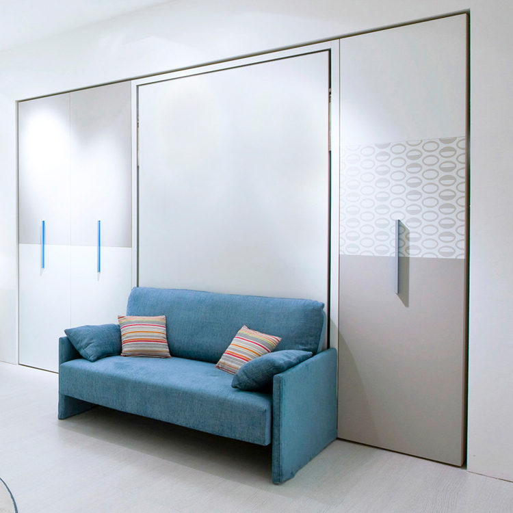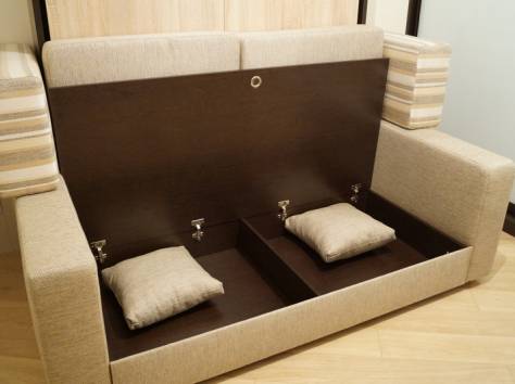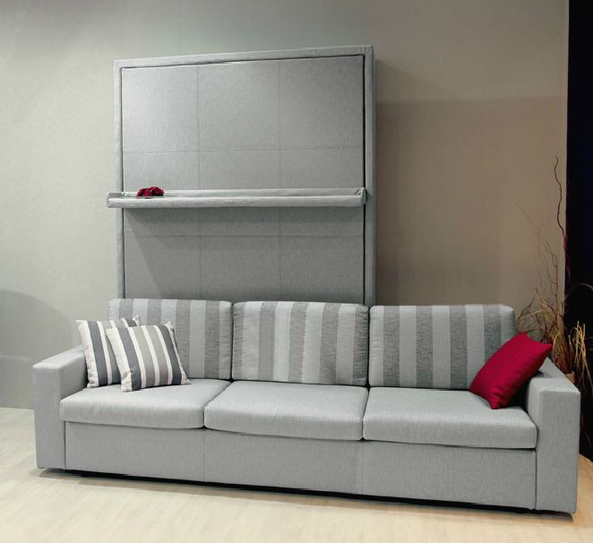 توجد الأريكة مباشرة عند قاعدة السرير. عندما يتم خفض السرير ، تتم إزالة الوسائد من الأريكة ، ويسقط. في هذه الحالة ، فإن الأريكة بمثابة موقف. بعد الاستخدام يتم رفع السرير. يبدو كما لو أن الأريكة وضعت ببساطة في الخزانة.