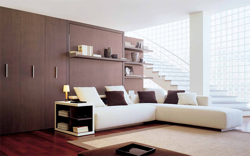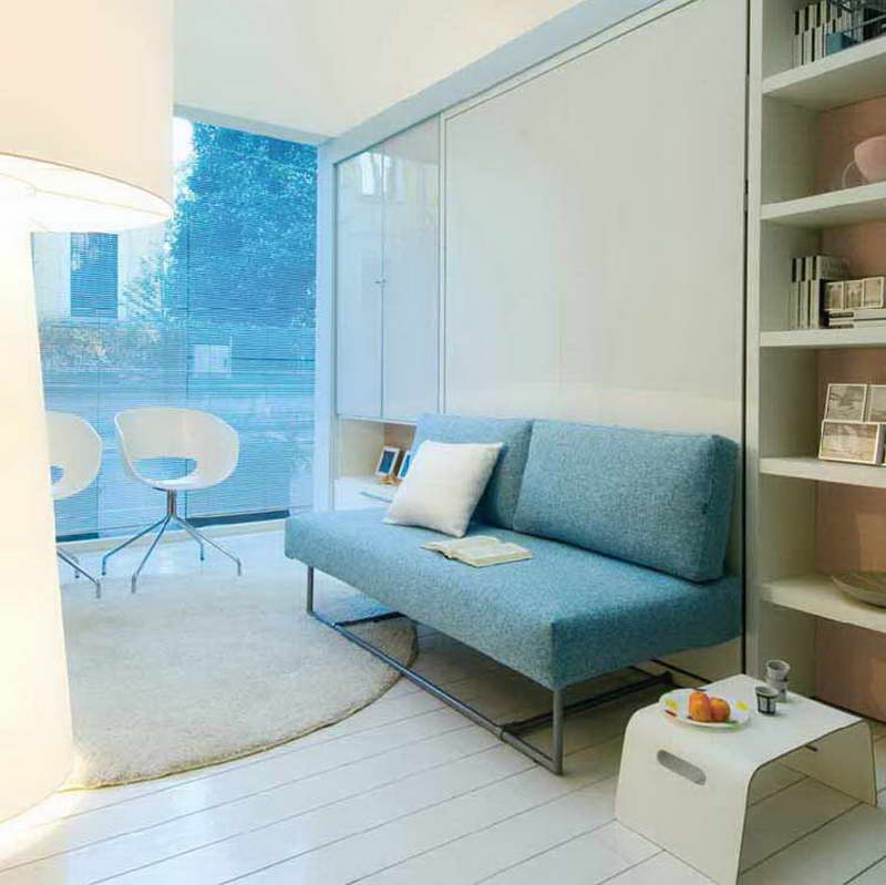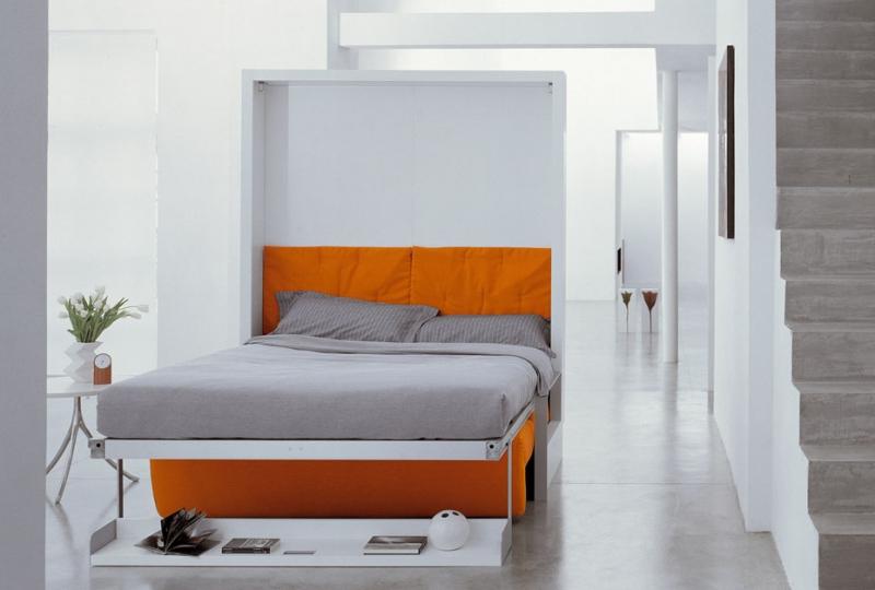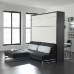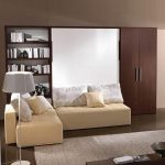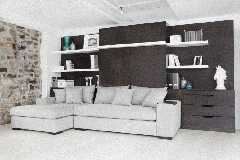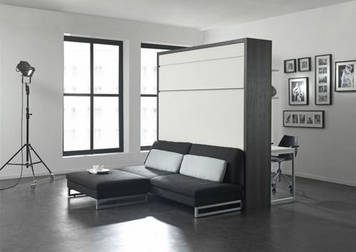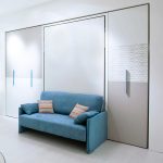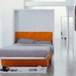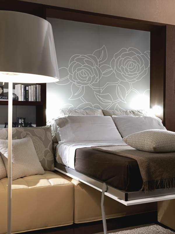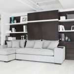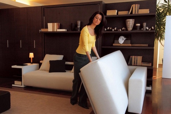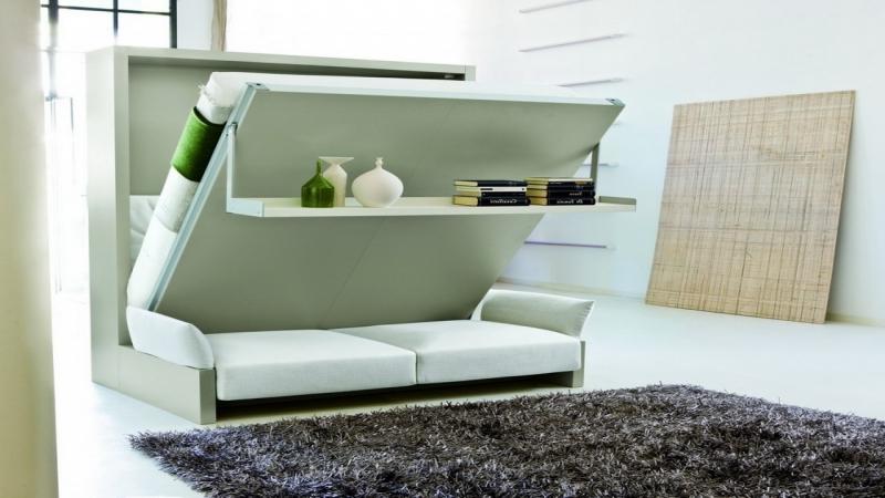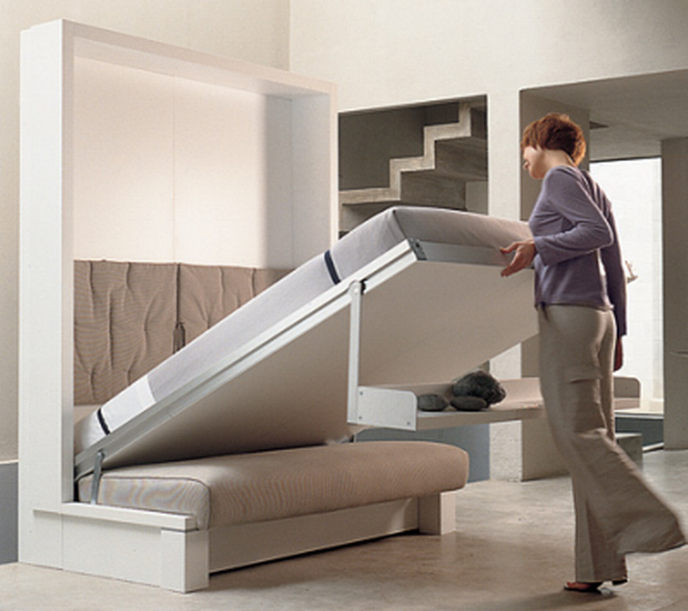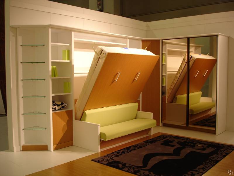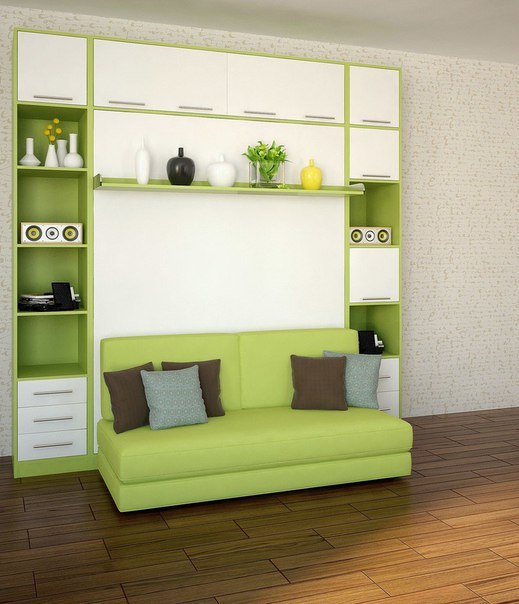 حل مثير للاهتمام في الداخل هو استخدام سرير الرفع مع أريكة. هذا النوع من الأثاث يكتسب شعبية متزايدة. يكمن جوهر التصميم في حقيقة أن السرير يرتفع على الينابيع أو ماصات صدمات الغاز بشكل رأسي ويشبه أبواب الخزانة.