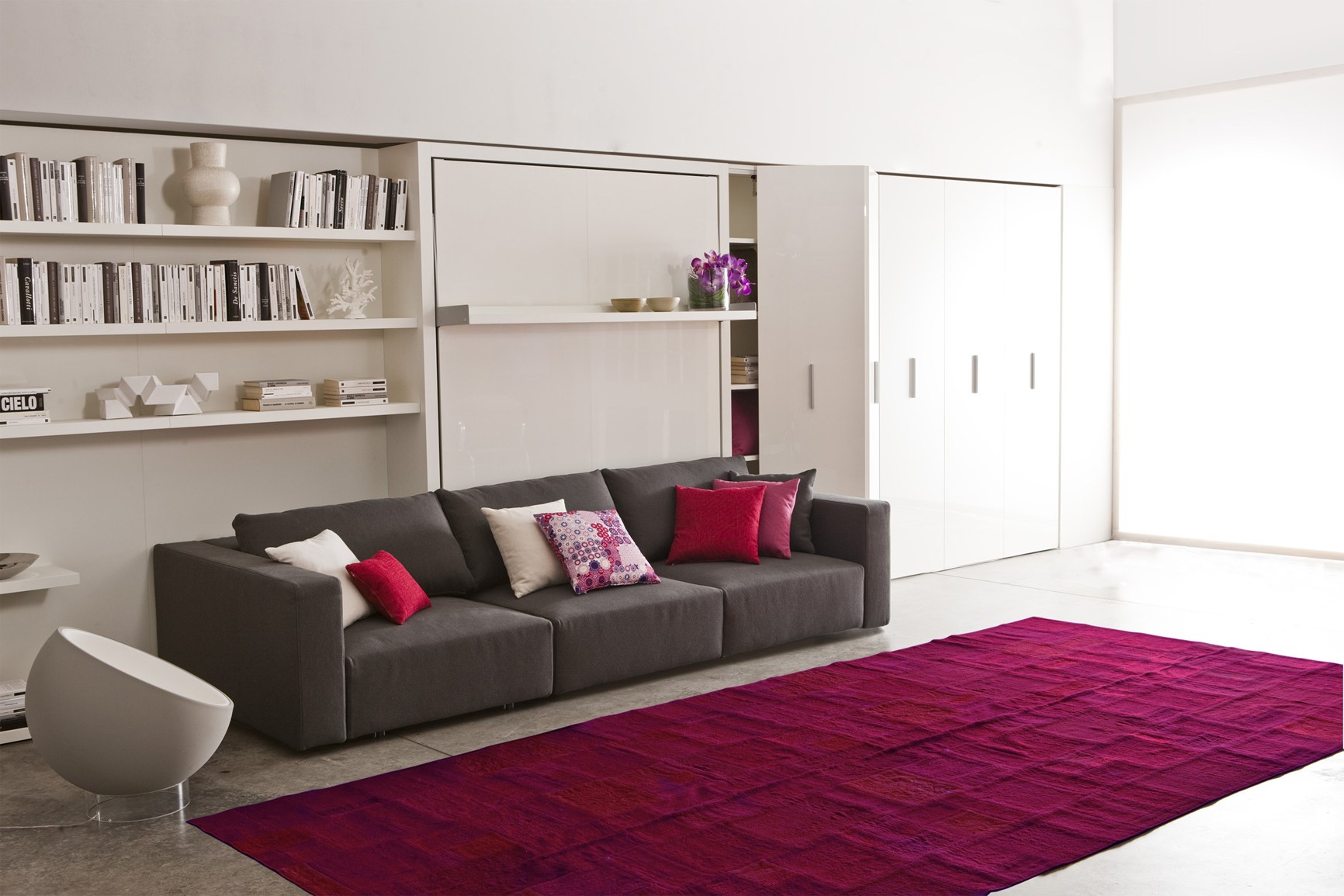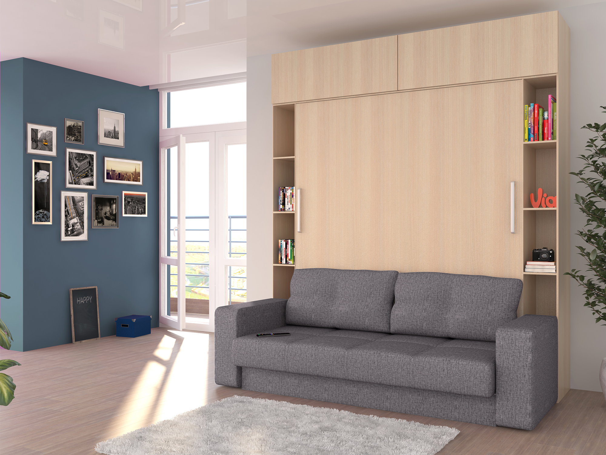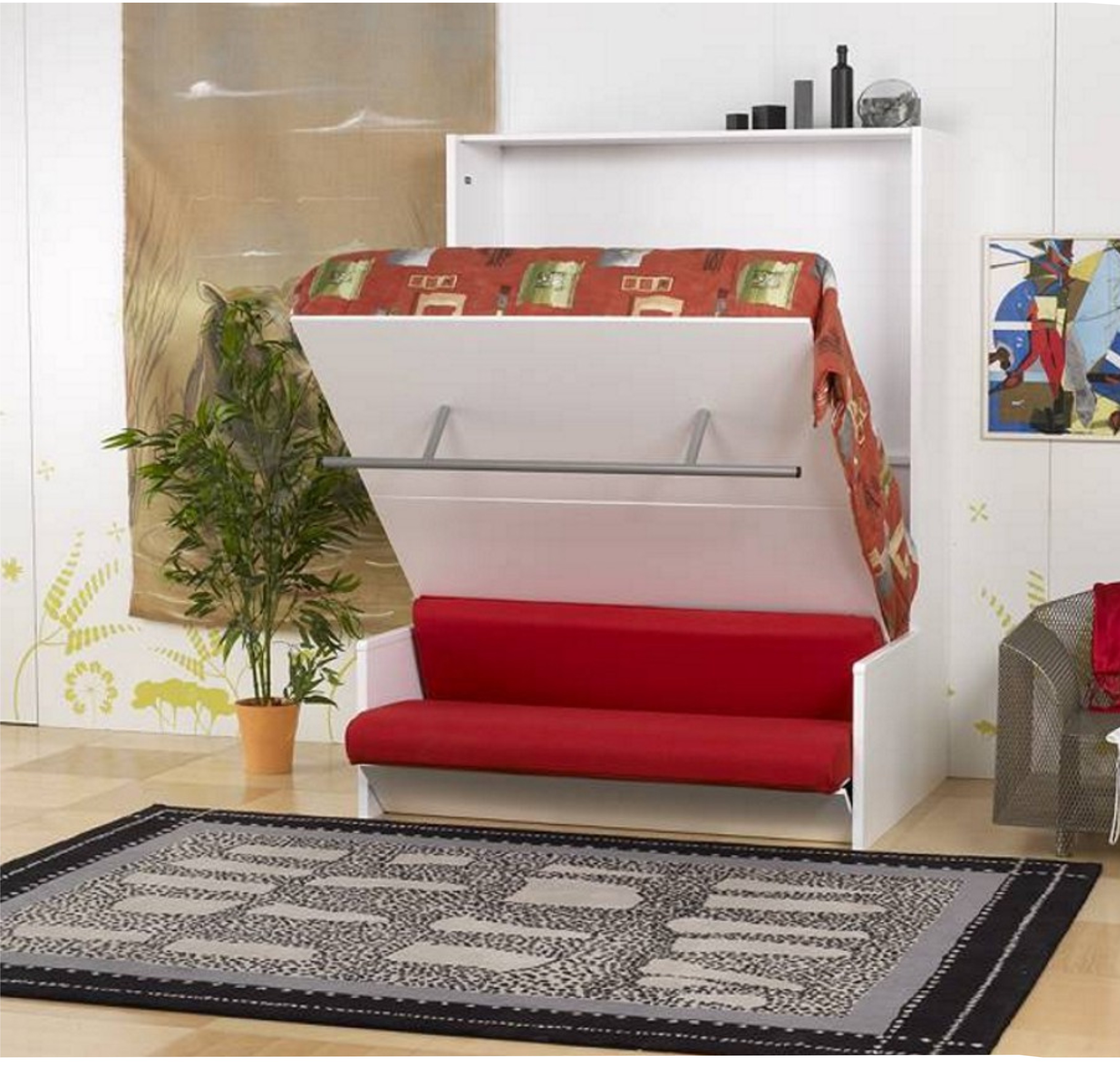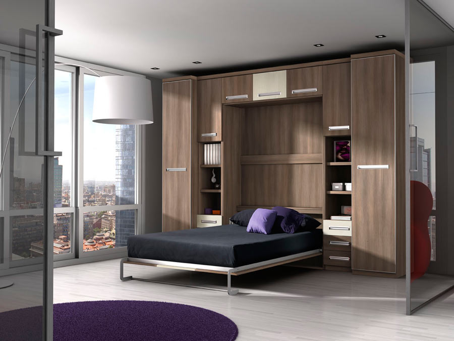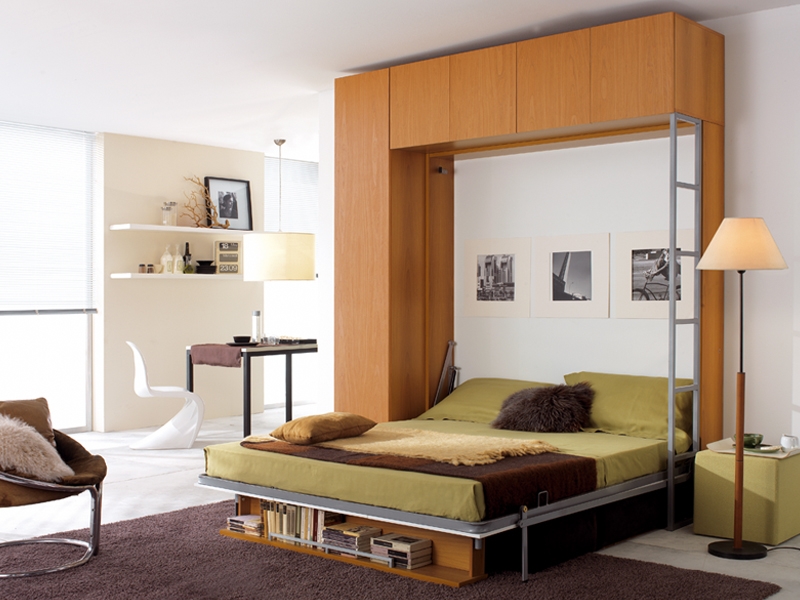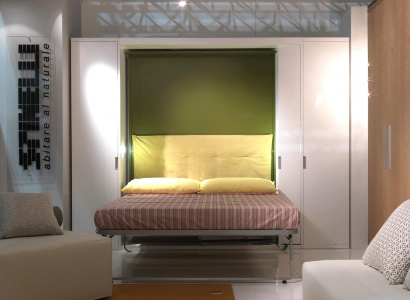 حل مثير للاهتمام في الداخل هو استخدام سرير الرفع مع أريكة. هذا النوع من الأثاث يكتسب شعبية متزايدة. يكمن جوهر التصميم في حقيقة أن السرير يرتفع على الينابيع أو ماصات صدمات الغاز بشكل رأسي ويشبه أبواب الخزانة.
