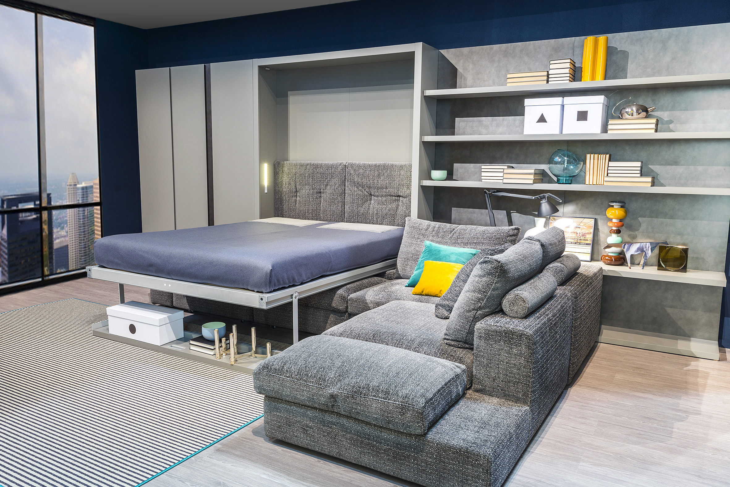 نظرًا لوجود الأريكة ، يعد هذا الطراز مثاليًا لغرفة المعيشة وغرفة النوم ، حيث لا توجد حاجة للنوم فحسب ، بل لاستقبال الضيوف أيضًا.