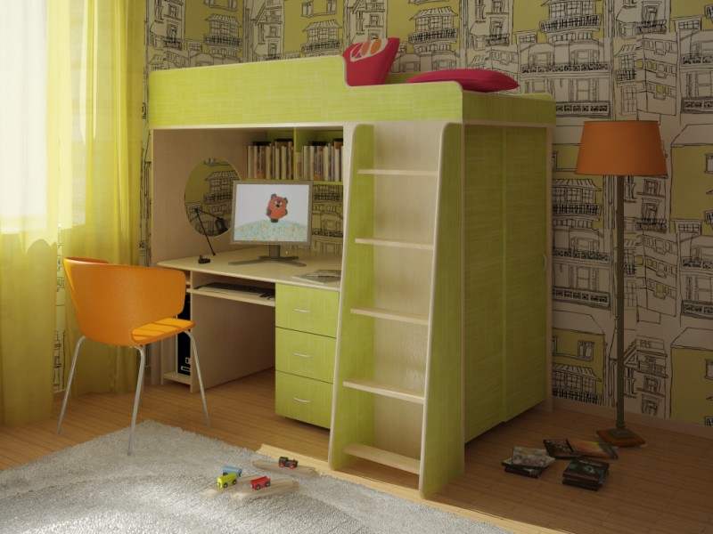 ميزة أخرى مميزة لمثل هذا السرير هي القدرة على استخدام نفس التصميم مثل مكتب متكامل.
