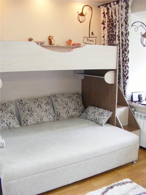 لا تنس أنه بالإضافة إلى السرير ، يمكن لسرير بطابقين أداء وظائف أخرى بنجاح. هنا يقضي الطفل وقت فراغه ، وهنا يحب القراءة والاستماع إلى الموسيقى واللعب. الأسرة بطابقين لديها إمكانات كبيرة في ترتيبها مع عناصر إضافية.