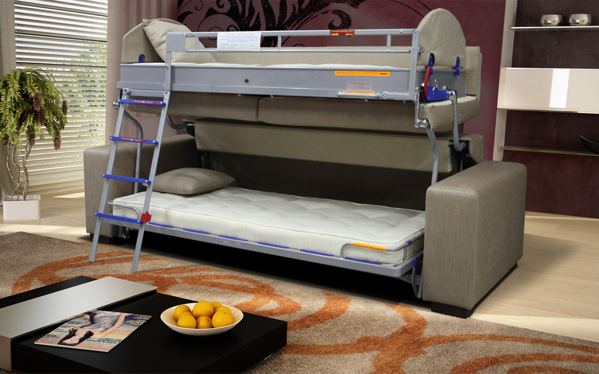 - اعتمادًا على توفر آلية قابلة للطي ، يمكن أن يكون السرير بطابقين: