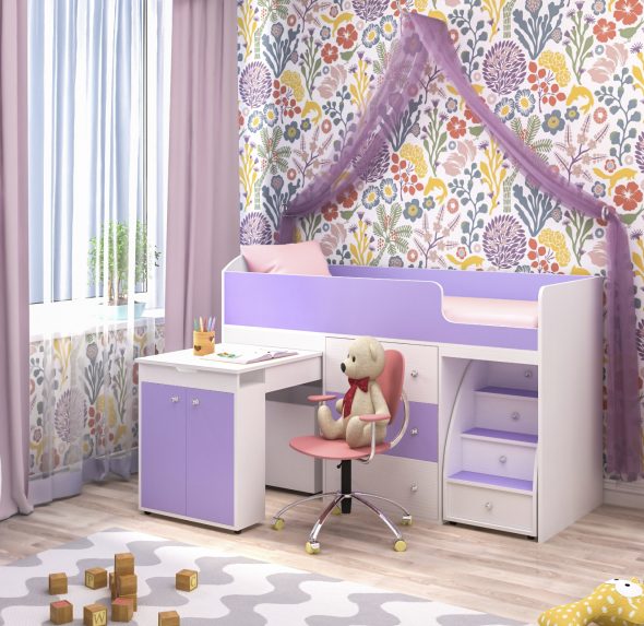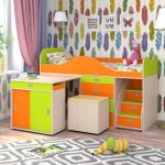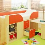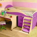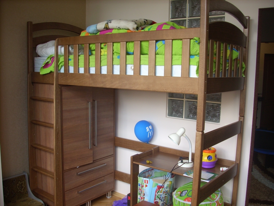 زائد في السرير مع سطح المنضدة الخارجة حيث أن ارتفاعه ضئيل. سرير صغير مناسب بشكل خاص للأطفال الصغار. خطر الاصابة الخطيرة من السرير هو الحد الأدنى تقريبا. كل المساحة الحرة تحت السرير ، تشغلها أدراج مدمجة. السلبية الوحيدة هي مكان العمل ، ليست كبيرة بما يكفي لإكمال العمل.