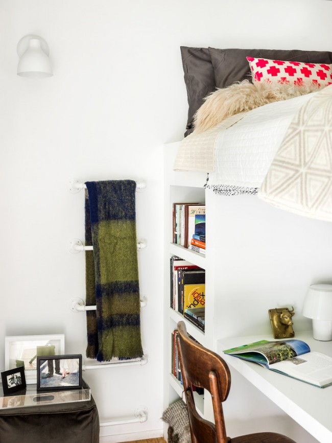 المباني السكنية لها عيب خطير - لا تحتوي الغرف على مساحة إضافية ، في حين أن الأثاث في الشقة يجب أن يكون واسع الحيلة. سيكون حول السرير مع طاولة. هيكل العلية السرير يشبه سرير بطابقين بسيط.