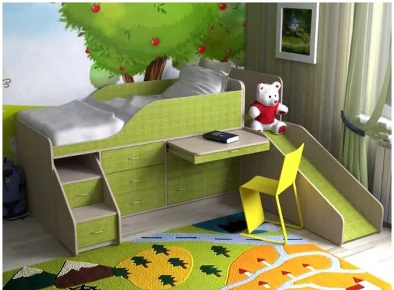 - السرير مجتمعة لديه تعدد المهام الصلبة. على سبيل المثال سرير أطفال مع طاولة بمثابة مكان للنوم واللعب والاسترخاء. بالإضافة إلى الطاولة ، يمكن دمجه مع خزانة ملابس أو أريكة أو مجرد غرفة ألعاب أو منطقة رياضية.
