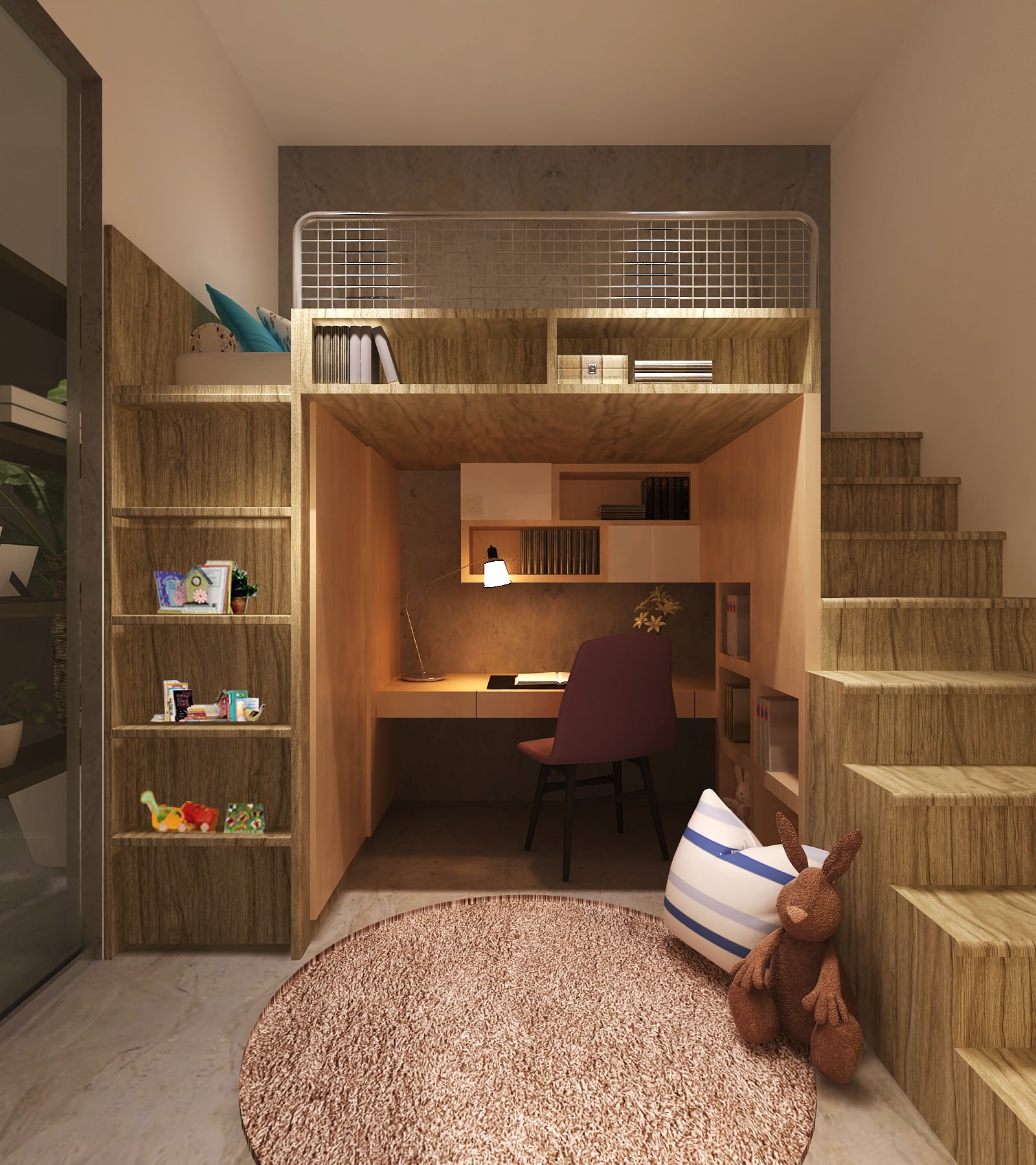 في كلتا الحالتين ، هناك درج ، وسرير في الطابق الثاني.