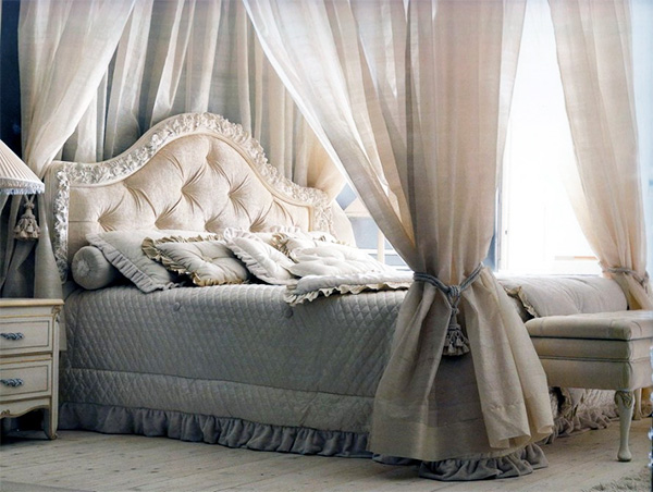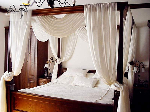 إذا تم توفير حوامل عمودية ضخمة في هيكل السرير ، فيمكن أن تزينها أقمشة الستائر الأصلية.