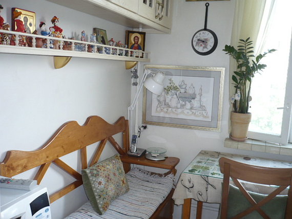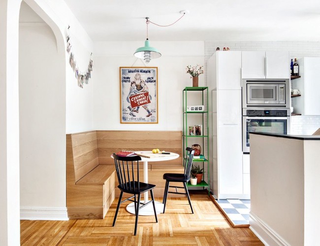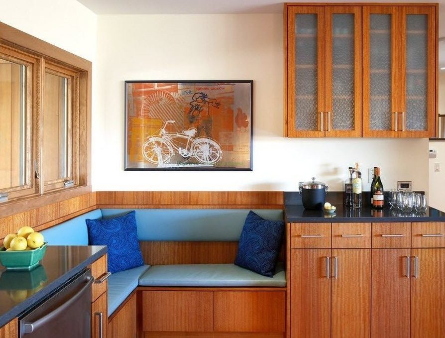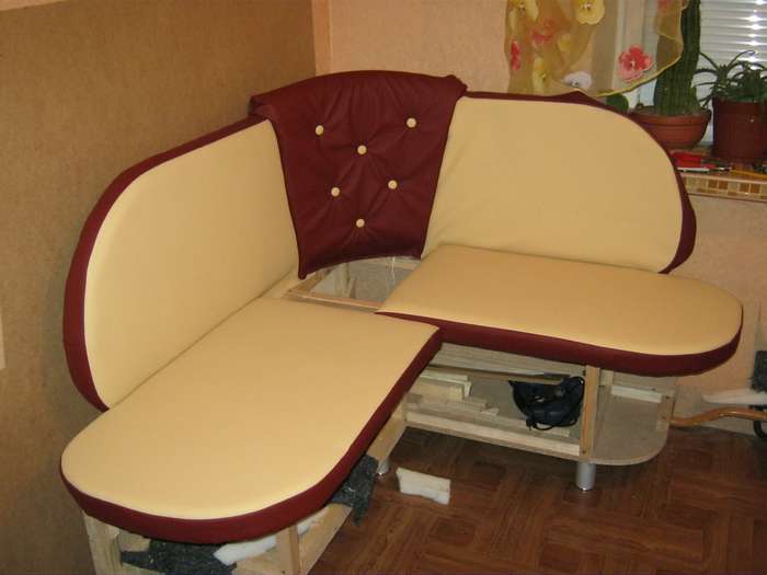 - إذا كنت قد صممت أريكة بدون مواد تنجيد ، يمكنك طلاءها بلون أثاث المطبخ ، أو على العكس من ذلك ، دعم لون عنصر الديكور الداخلي بالألوان.مزيج من اثنين من الألوان المتناغمة سوف تبدو مثيرة للإعجاب.