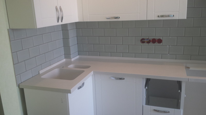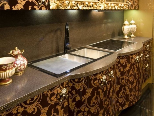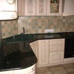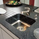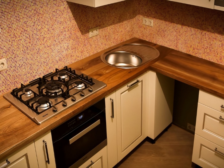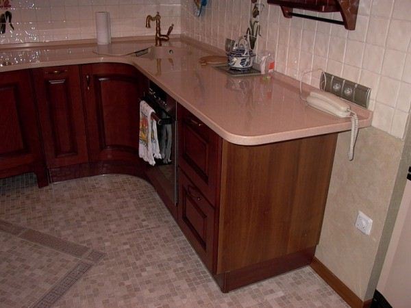 بالإضافة إلى الجمالية ، فإن سطح الطاولة الجيد له أيضًا وظيفة صحية: فهو يغلق المفاصل بين قطع الأثاث بشكل موثوق ، مما يمنع تطور البكتيريا الضارة ، وهو أمر مهم بشكل خاص للمنطقة المحيطة بالوعة.