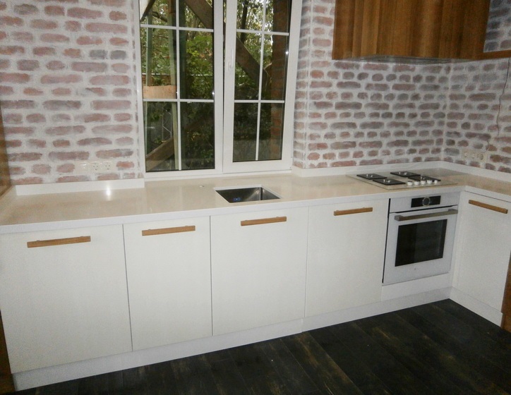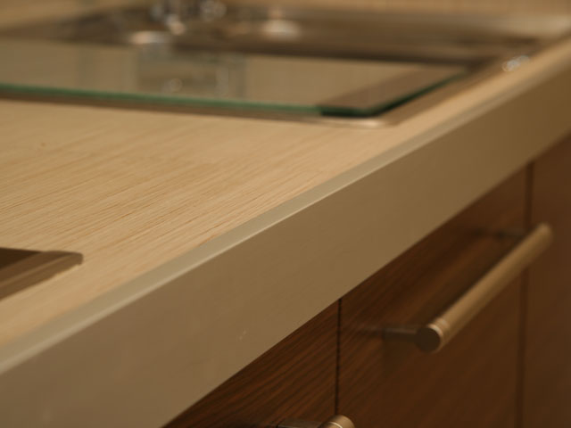 في مطابخ الدرجة الاقتصادية ، تُستخدم ألواح الخشب الرقائقي المبطنة أو المُغلفة فقط لتجنب الأضرار وانبعاثات الفورمالدهايد.