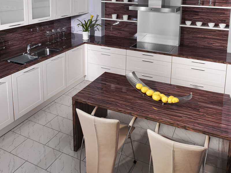 وغالبا ما تستخدم هذه المواد للمطابخ. هناك عدة أسباب لذلك. أولاً ، نظرًا لسهولة التصنيع ، فهي غير مكلفة نسبيًا ، وبالتالي ستكون تكلفة المجموعة بأكملها مقبولة. ثانيا ، يجذب مجموعة متنوعة من نمط (الديكور). وثالثا ، لن يكون من الصعب اختيار التكوينات المختلفة (مدورة ، على شكل حرف U ، على شكل حرف L وغيرها). عرض الورقة 60 سم ، ولكن هناك خيارات أخرى: من 40 سم إلى 120 سم ، الطول من 230 سم إلى 350 سم ، متوسط الارتفاع من 2.8-3.8 سم.