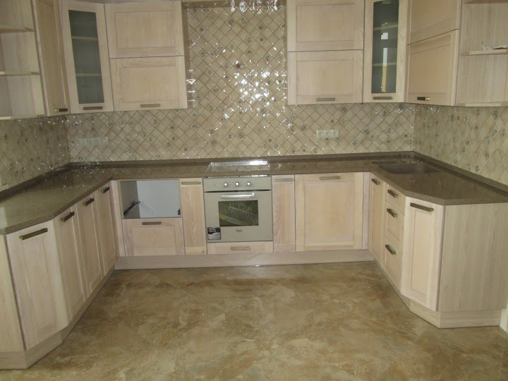الزجاج ، الحجر الطبيعي أو الاصطناعي ، مجموعة من الخشب الطبيعي ، اللوح الرقائقي - مجموعة متنوعة من أسطح المطبخ.