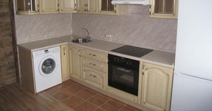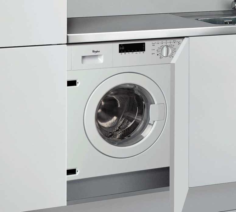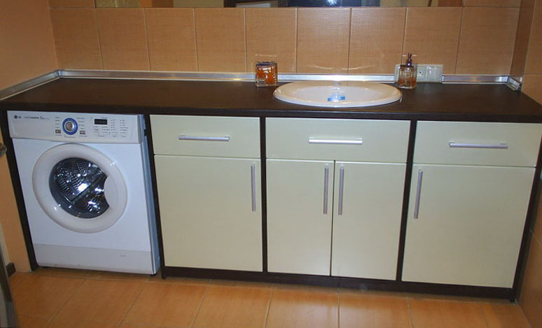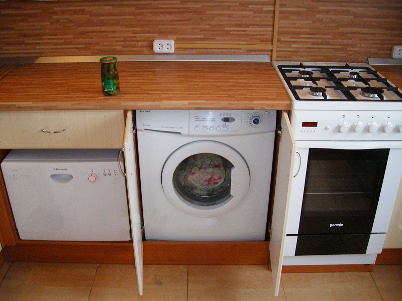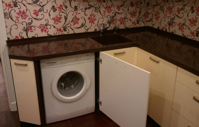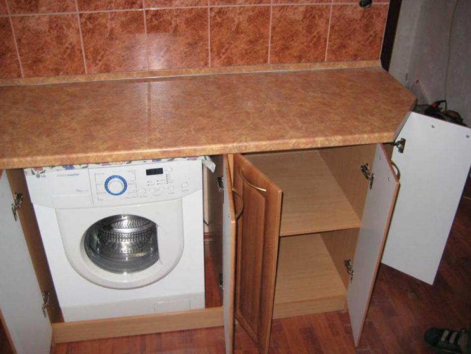 هذه هي الطريقة الأكثر شيوعًا للتضمين غسالة. يغلق تماما. الأبواب الأمامية مطبخ خزانة ، أعلى - أعلى الجدول.