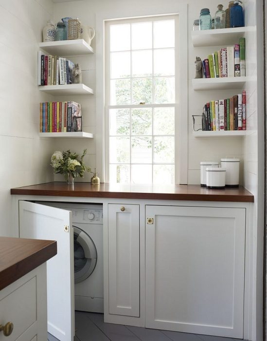 الآن لا يتعين عليك القرفصاء أو الانحناء لتحميل وإخراج الغسيل. بالإضافة إلى ذلك ، إنه خيار رائع من حيث الاستخدام الرشيد. مطبخ الفضاء - المكان وفوق وتظل الجهاز وظيفية.