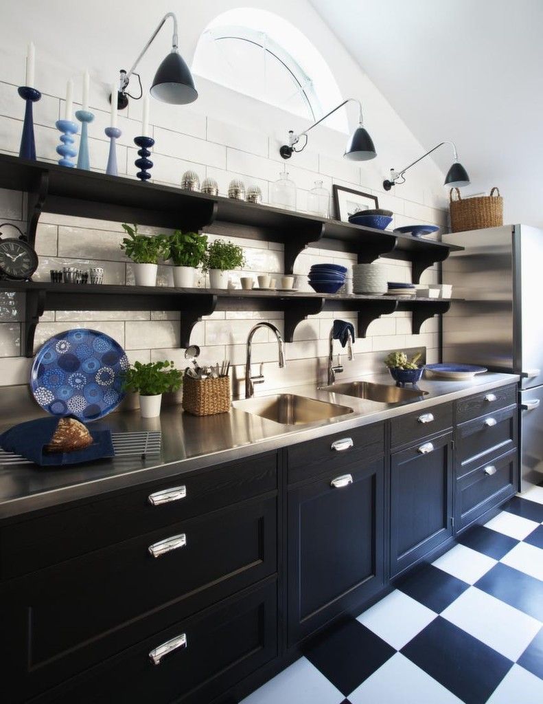 يمكن أيضًا التبرع بجزء من حواجز الأرضيات عن طريق تثبيت أرفف مفتوحة. صحيح أن الأرفف نفسها يجب أن تكون أكثر كثافة وأثخن من الأرفف المركبة ، حيث يتم الاحتفاظ دومًا بأدوات المطبخ الضخمة والأجهزة المنزلية: عصارة ، مطحنة لحم ، أواني ذات سعات مختلفة وأواني للقلي.