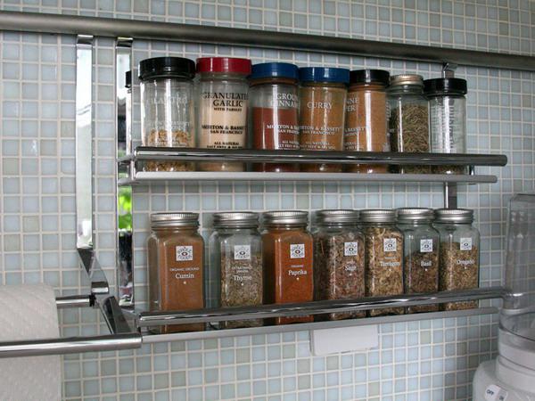 بالإضافة إلى الرفوف المفتوحة ، يمكن أن يكون هناك أرفف على التركيبات المثبتة في الحائط. مثل هذه الخطوة سوف تساعد في توفير مساحة في المطبخ وتجعل الغرفة بناءة قدر الإمكان. هذه الأرفف ، كقاعدة عامة ، مصنوعة من دريوال. تبدو جيدة ، وظيفية ، يمكن أن تحمل وزنا كبيرا. العيب الرئيسي للتصميم هو التثبيت الثابت. إن تفكيك أرفف المطبخ هذه دون ألم يمثل مشكلة كبيرة وسيضطر إلى استخدامها حتى الإصلاح الشامل التالي.