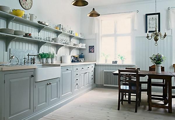 على سبيل المثال ، عند اختيار النمط الاسكندنافي ، يجب أن تكون الأرفف المفصلية مصنوعة من مواد طبيعية وخشب وحجر (ينبغي إيلاء اهتمام خاص للتثبيتات واختيار المكان ، وتكون التصميمات ثقيلة إلى حد ما). بالنسبة لمجموعة الألوان ، يجب عليك اختيار اللون البيج والرمادي الفاتح والأزرق الفاتح والأخضر الفاتح والبني الفاتح ، حيث يهدف هذا النمط إلى الحفاظ على الدفء والراحة في المنزل. مثل هذا الجمع بين الألوان والمواد سيكون بالتأكيد الحل الحصري في داخل المطبخ.