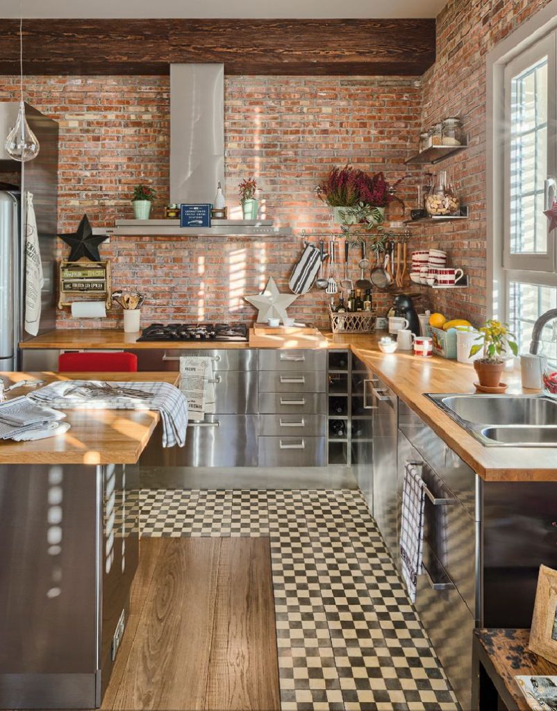 - اللوح أو ألواح الصلب. من خلال صفاته ، فهو أقل شأنا من الخشب ، ولكن أيضا جذابة للغاية وظيفية. تتميز تصميمات المطبخ بالموثوقية وسهولة الصيانة.