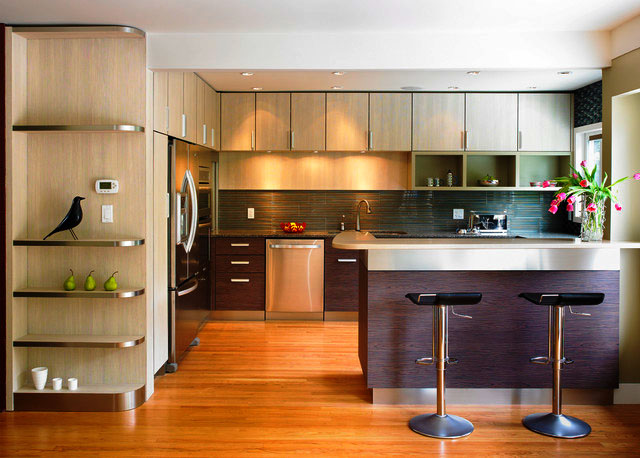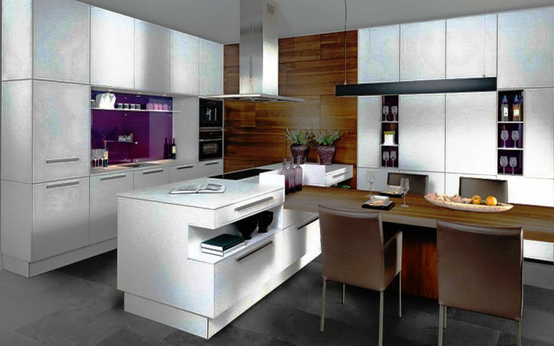 تصميم المطابخ الحالية يجعل من الممكن تجربة موقع قطع الأثاث. الجميع على دراية بمظهر كلاسيكي ، أي أن وضع خزانات الحائط على منطقة الطهي لم يعد شائعًا. في السابق ، كان يتم وضع الأثاث عادةً على الحائط ، ولكن الآن يتم وضعها في كثير من الأحيان في وسط الغرفة. وهذا يجعل من الممكن تقسيم المطبخ ، إذا سمحت مساحته ، إلى منطقتين رئيسيتين - مكان للطبخ ومنطقة لتناول الطعام. عندما تصل الخزانات إلى السقف ، يتم تشكيل محاكاة كاملة للجدار.