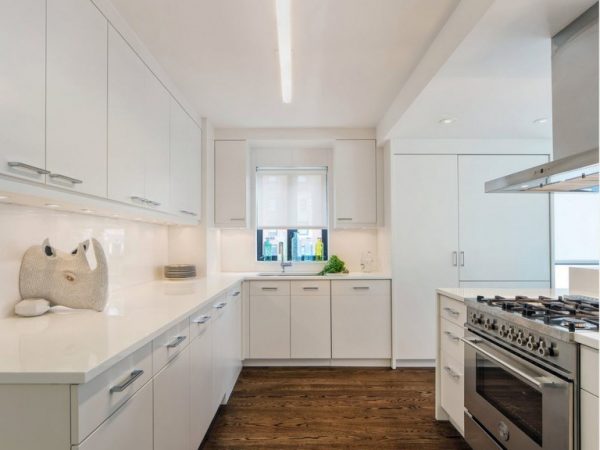 اللون المثالي للجدران والأثاث العالي لمطبخ ضيق أو صغير بأسلوب التكنولوجيا الفائقة - أبيض