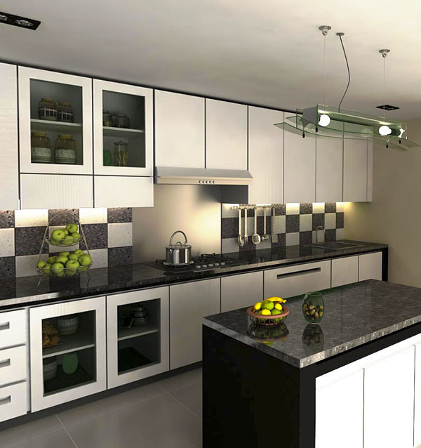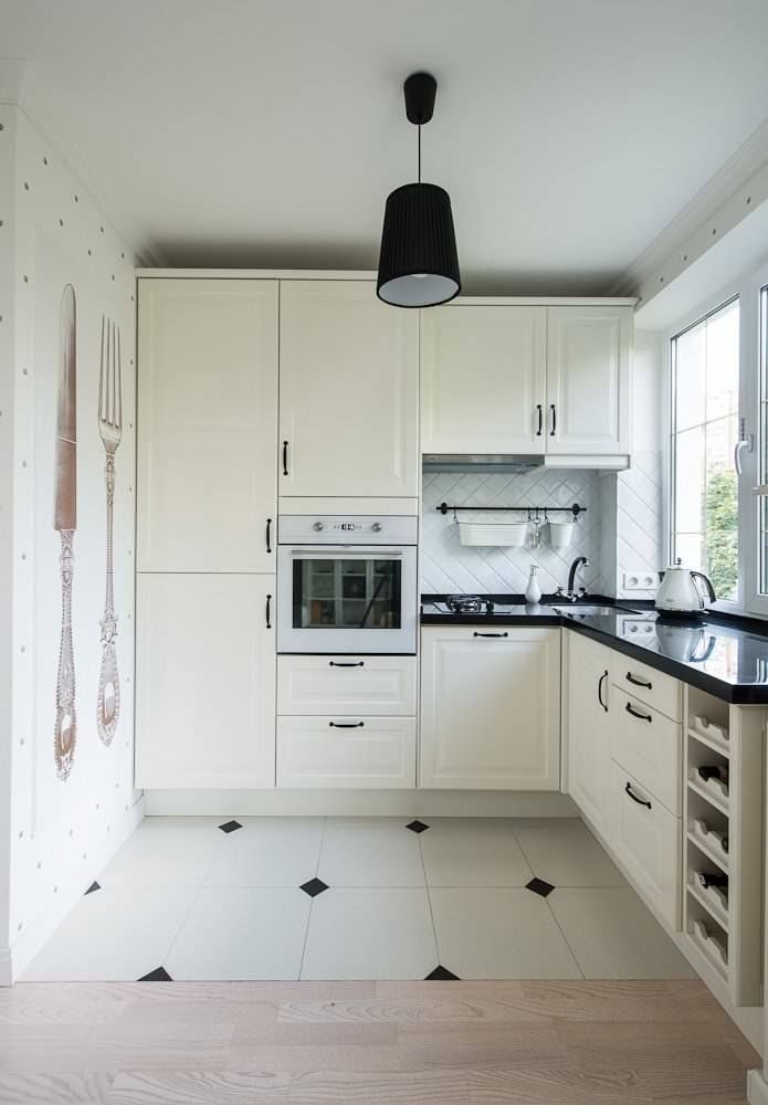 مطبخ أبيض وأسود مع واجهات MDF مع خزائن مرتفعة