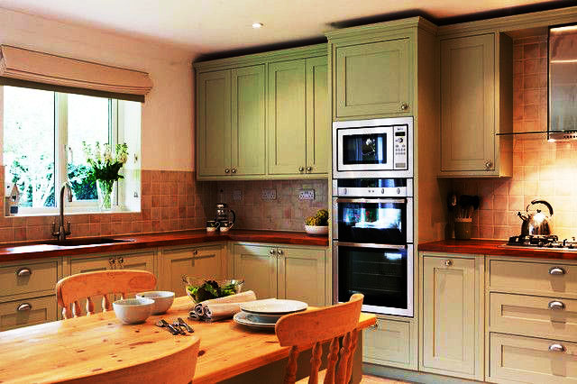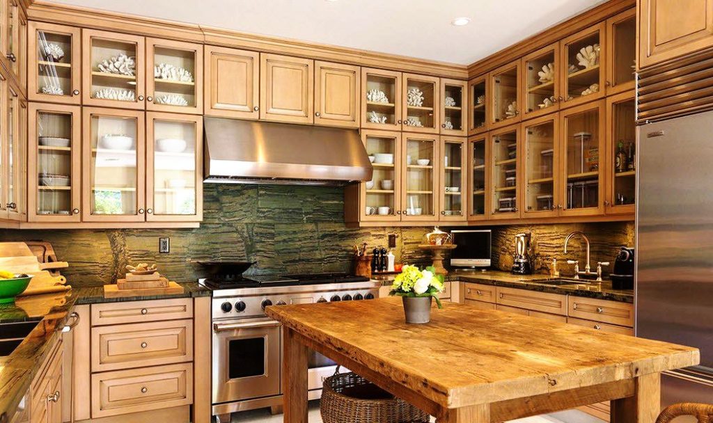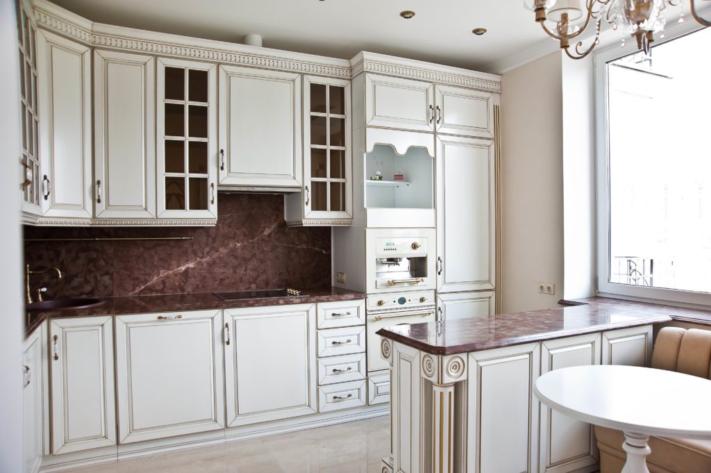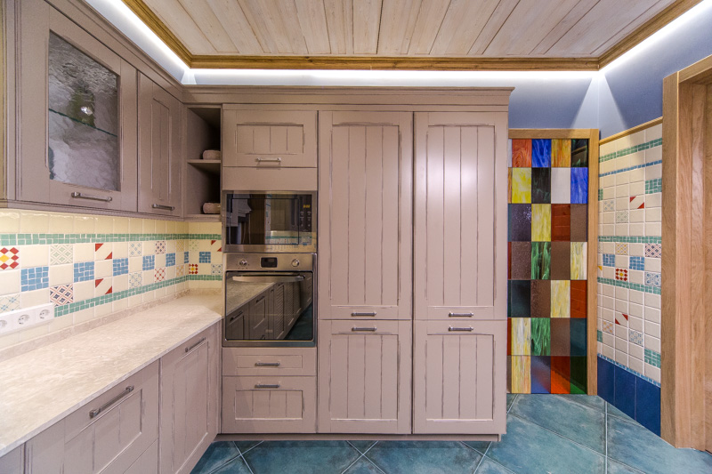 للأسلوب الكلاسيكي وبروفانس ، الخيار الأفضل هو خزانات كبيرة مصنوعة من الخشب الطبيعي أو تقليد تحتها. يجب دمج نظام الألوان مع سمات المطبخ الأخرى.