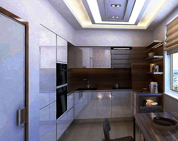 يجب أن يتم اختيار الخزائن الموجودة في السقف مع مراعاة المساحة الداخلية للمطبخ ككل. هذا هو خيار كبير للمطبخ التكنولوجيا الفائقة. هذا الأثاث يبدو العضوية للغاية. بالإضافة إلى ذلك ، يتم توفير مساحة ، وهو أمر مهم للغاية في وجود مطبخ صغير.