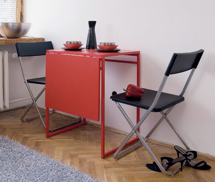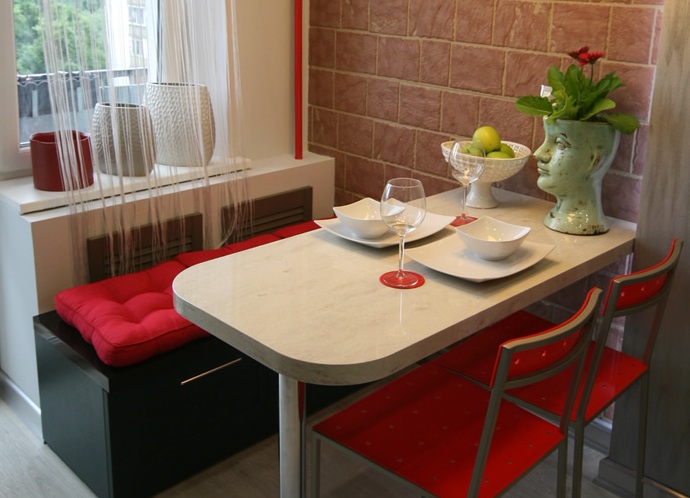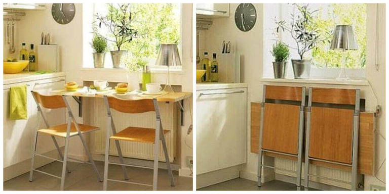 هناك خيار آخر لمعدات المطابخ الصغيرة وهو الطي. عندما يتم الضغط على كونترتوب على الحائط ولا يبرز أكثر من 10-15 سم ، وإذا لزم الأمر ، يتم فتح كونترتوب وتشكيل مقعد صغير لشخصين. هذا النوع من الأثاث مناسب لأصغر الشقق ، حيث لا توجد مساحة كافية في المطبخ حتى للطاولات الصغيرة. من الأفضل أيضًا اختيار كراسي قابلة للطي في هذه الحالة لتوفير المساحة. بالمناسبة ، يوصي خبراء التغذية في كثير من الأحيان بمثل هذه النماذج ، حيث أن الشخص كسول لوضع المنتج وبالتالي يمكنه تخطي وجبة كبيرة والحصول على وجبة خفيفة صغيرة في شكل تفاحة أو شرب اللبن.