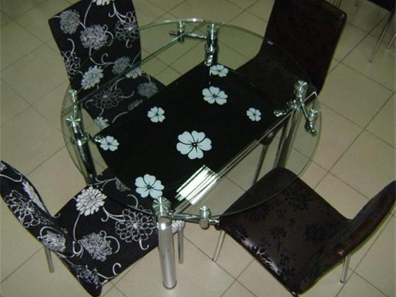 طاولة زجاجية مع نوعين من الكراسي لمطبخ صغير