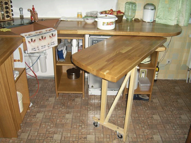 في الآونة الأخيرة ، أصبحت الهياكل القابلة للسحب شائعة بشكل متزايد في الغرف الصغيرة. وينطبق هذا بشكل خاص على الشقق ذات الطراز عالي التقنية ، حيث يوجد بساطتها الصارمة. إذا لزم الأمر ، يتم سحب الدرج من وحدة المطبخ ، والذي يتحول بالفعل إلى طاولة منزلقة. يمكن أن يقف خلفه شخص بالغ أو طفلان. مع هذا التصميم ، غالبًا ما لا يتم تثبيت سطح الطاولة بقدم إضافية ، لذلك يجب أن نتذكر أنه لا ينبغي وضع أشياء ثقيلة عليه.