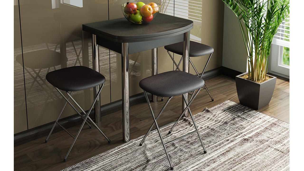 - بالنسبة للمطابخ الصغيرة جدًا ، يجب أن تفضل الكراسي القابلة للطي أو البراز ، والتي يمكن إخفاؤها بسهولة أسفل الطاولة.